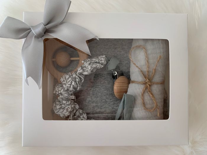 Le box bébé naissance 6 pièces , est composé de : - hochet en bois - bonnet 0-6 mois -moufle 0-6 mois -chaussettes 0-6 mois -bavoir -attache tétine en tissu Il y a différentes colories