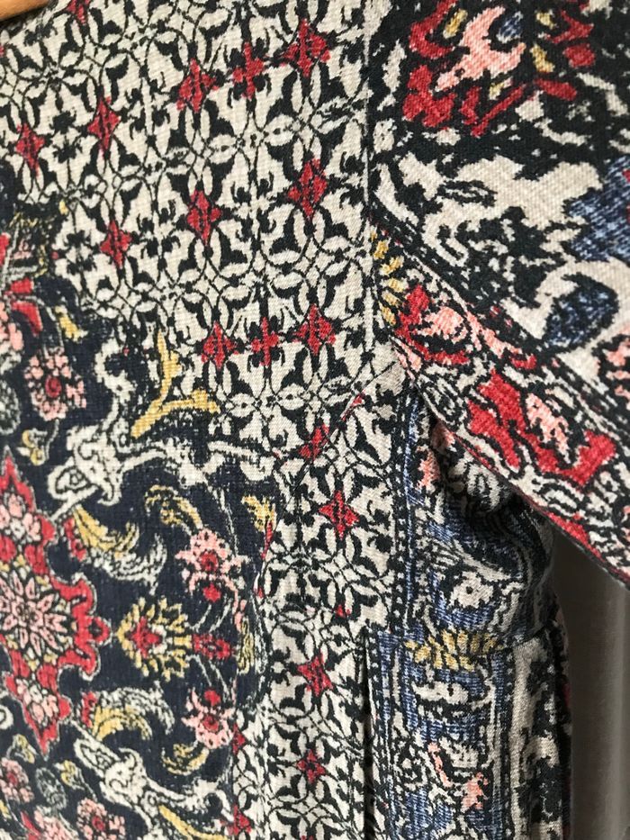 Robe manches longues Imprimé baroque tons bleu marine rouge jaune écru rose 100% viscose Entièrement doublée sauf les manches Taille 13/14 ans 164 cm Zara Très bon état sauf le curseur de la fermeture, le vernis bleu est partiellement parti