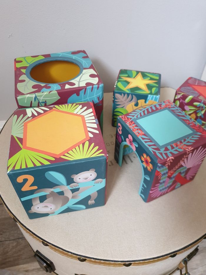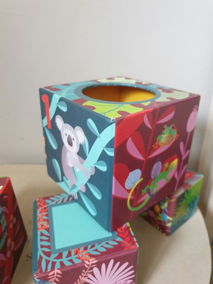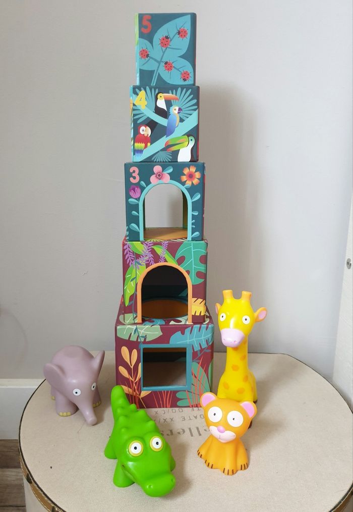 Bonjour , Je vends des boites à empiler avec ses animaux qui se cachent à l'intérieur. Pour le côté ludique, il y a les animaux sur les boites ( coccinelles, perroquets, singes, koalas, grenouilles....) et en objet ( girafe, crocodile, éléphant, tigre) des chiffres sur chaque boite, des couleurs, des fleurs. Matière : boite cartonnée rigide et jouet plastique très rigide. N'hésitez pas à me contacter. D'autres articles sont mis en vente
