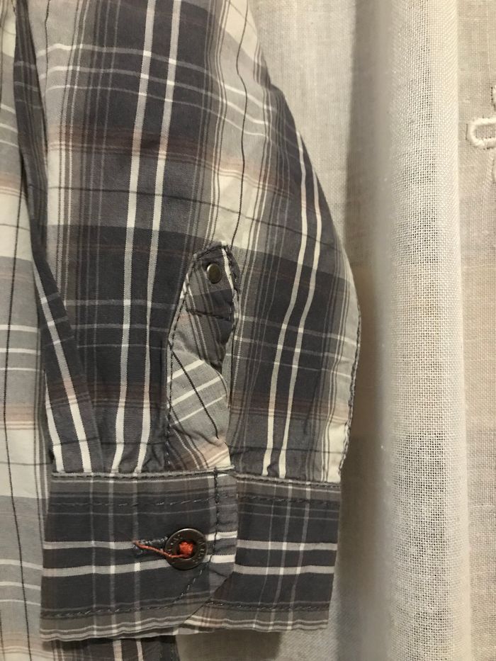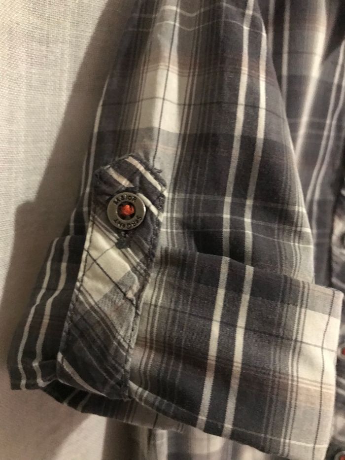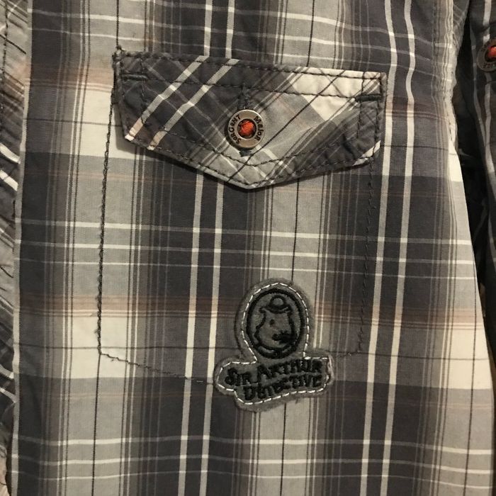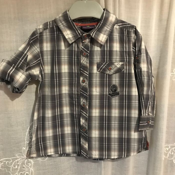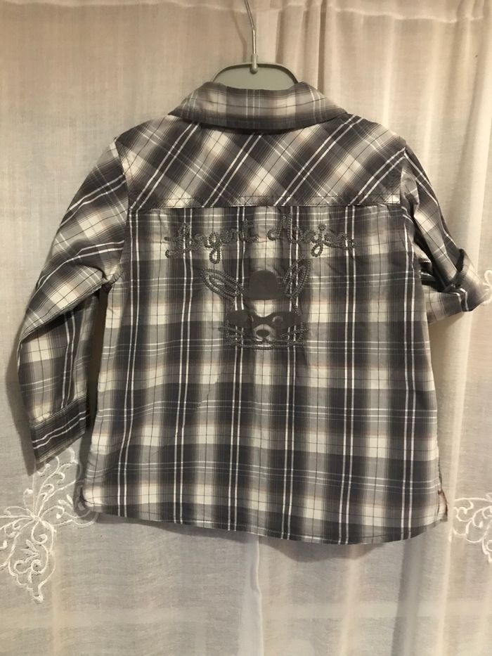 Chemise écossaise grise et blanche , fendue sur les côtés Lapin masqué brodé dans le dos Pattes boutons pour remonter les manches longues Taille 18 mois 81 cm Sergent-major