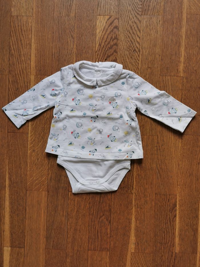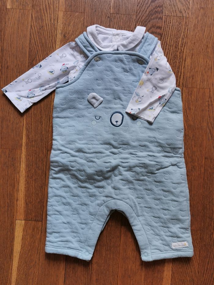 Très joli ensemble Sergent Major composé d'une salopette molletonnée bleu ciel (ouverture par pressions, y compris côté siège) et d'un body-T-shirt imprimé avec col Taille 3 mois, porté mais reste en très bon état Ensemble chaud
