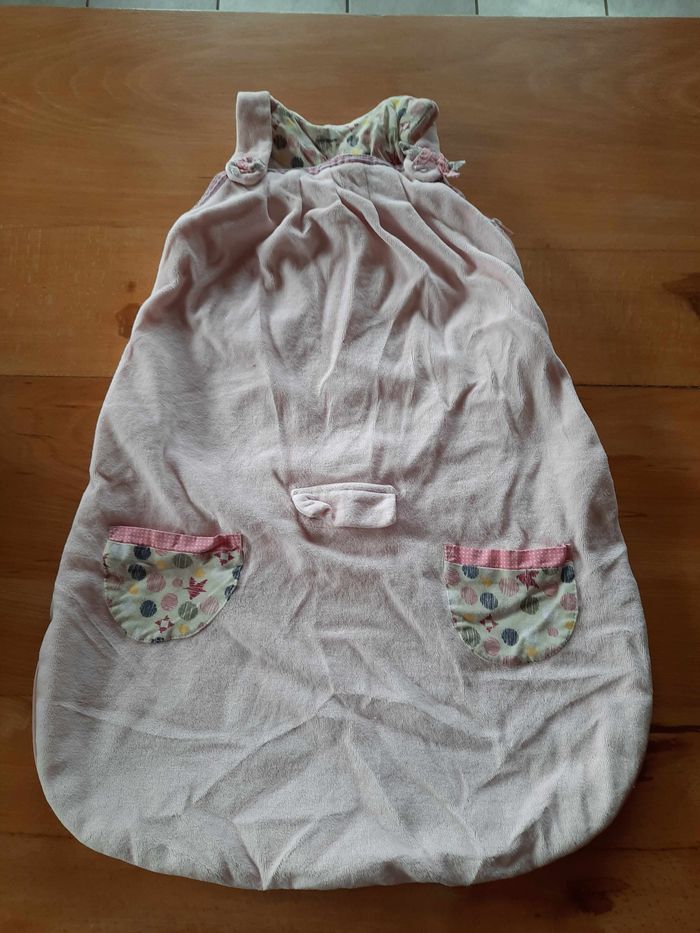 Gigoteuse Vert Baudet rose. Fermeture par zip sur le côté et pressions aux épaules. Longueur : 70 cm Largeur : 40 cm