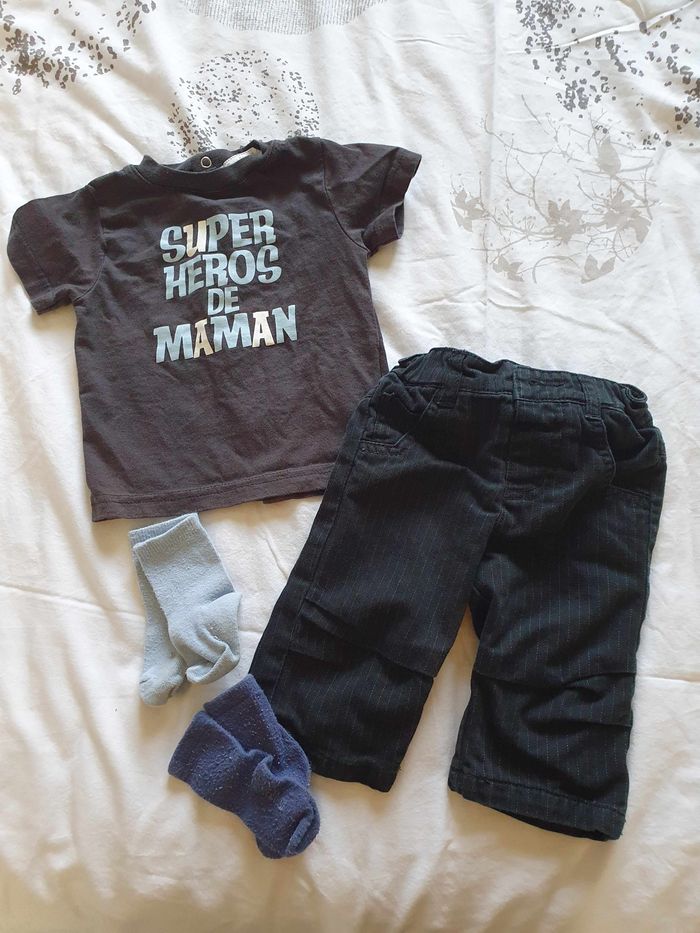 Ensemble comprend le pantalon noir, 2 paires de chaussettes 15/17 et le t-shirt qui ferme par pression à l'arrière