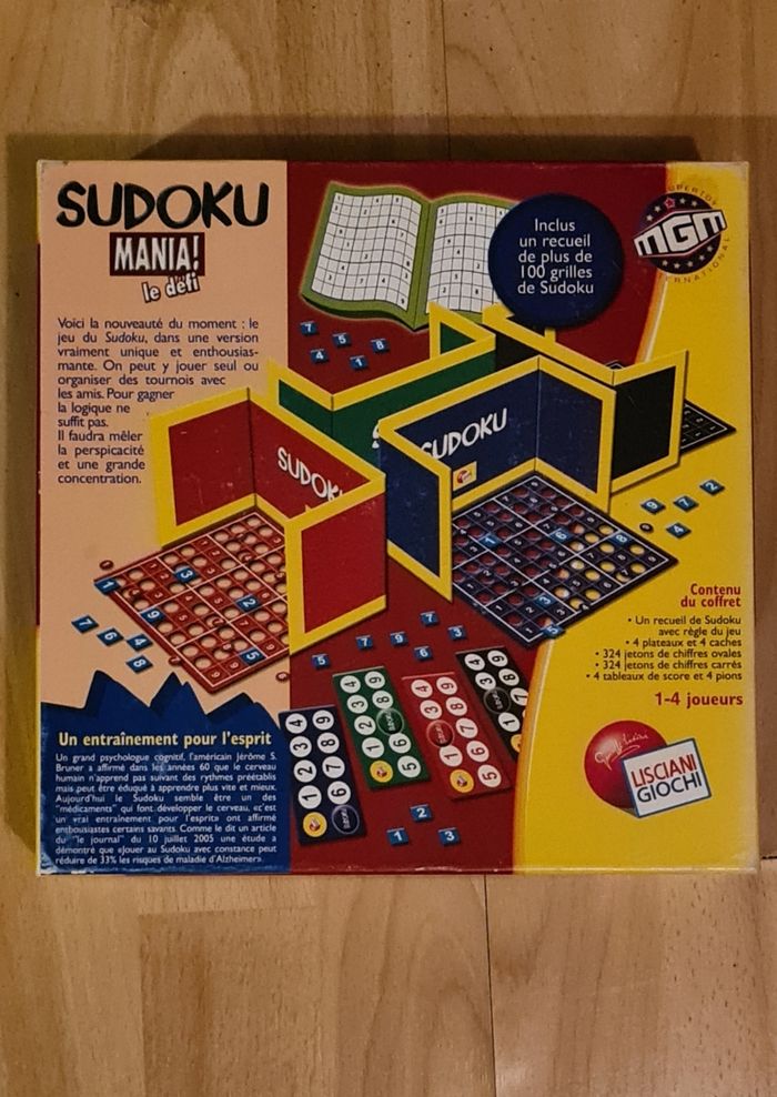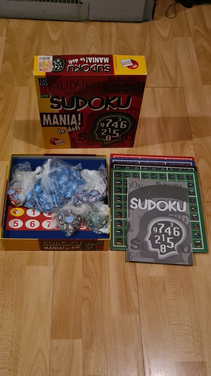 Je vends ce jeu de société Sudoku Mania le défi ! Sur la 2ieme photo, on ne voit pas toutes les pièces mais le jeu est complet. Chaques pièces sont dans des sachets (photo 1). Je viens de compter toutes les pièces ! Il contient : - Un recueil de Sudoku (de + de 100 grilles) avec règle du jeu - 4 plateaux et 4 caches - 324 jetons de chiffres ovales - 324 jetons de chiffres carrés - 4 tableaux de score et 4 pions À partir de 6 ans De 1 à 4 joueurs N'hésitez pas à me contacter 😊