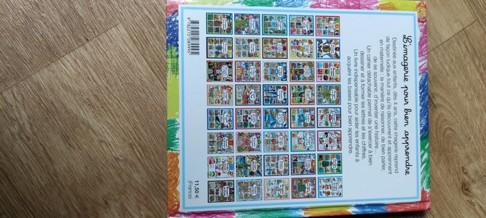 Livre avec des images colorées et des petits textes explicatifs, contient des autocollants (quelques uns manquent), des petits exercices de dictions, des petits jeux. Pages épaisses et plastifiées.