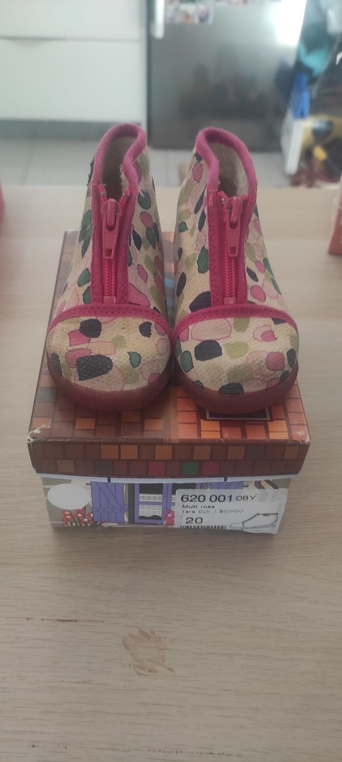 Chaussons fille taille 20 bonne état, juste le tissus un peut noircit. Semelle intérieure en cuir.
