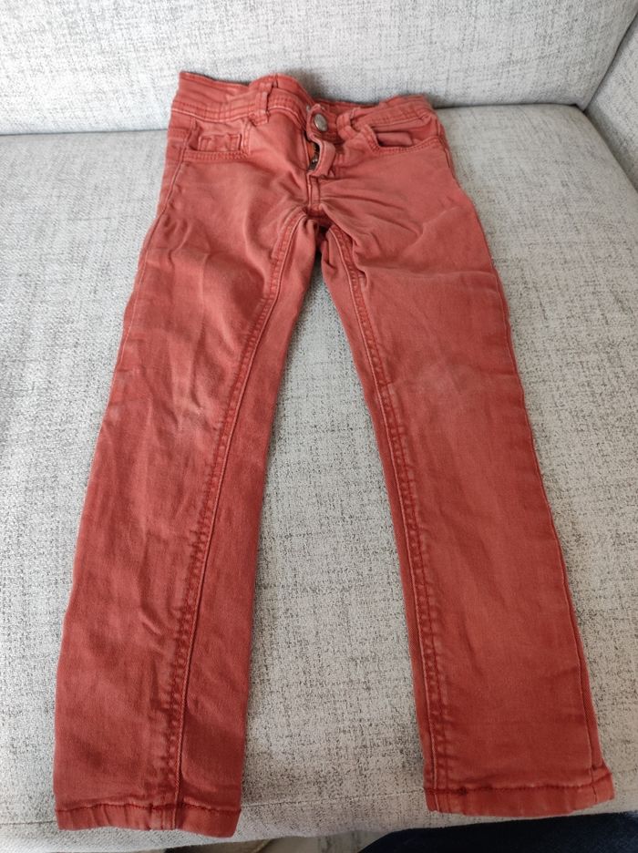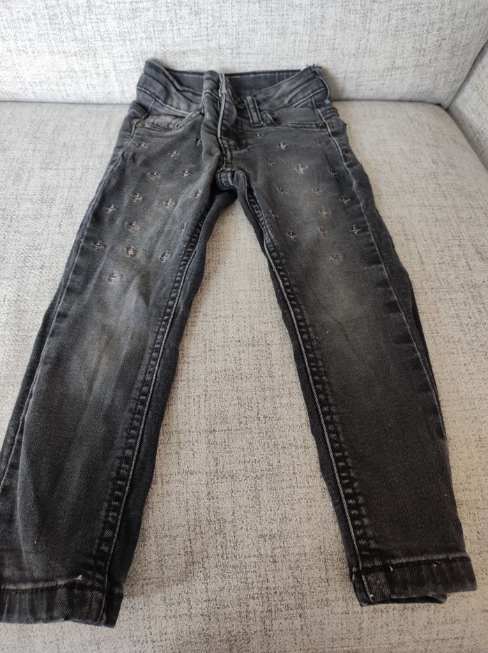 Lot de deux jeans taille 4ans. Rouille en bon état, jean noir avec des étoiles couleur un peu passée sur les genoux.