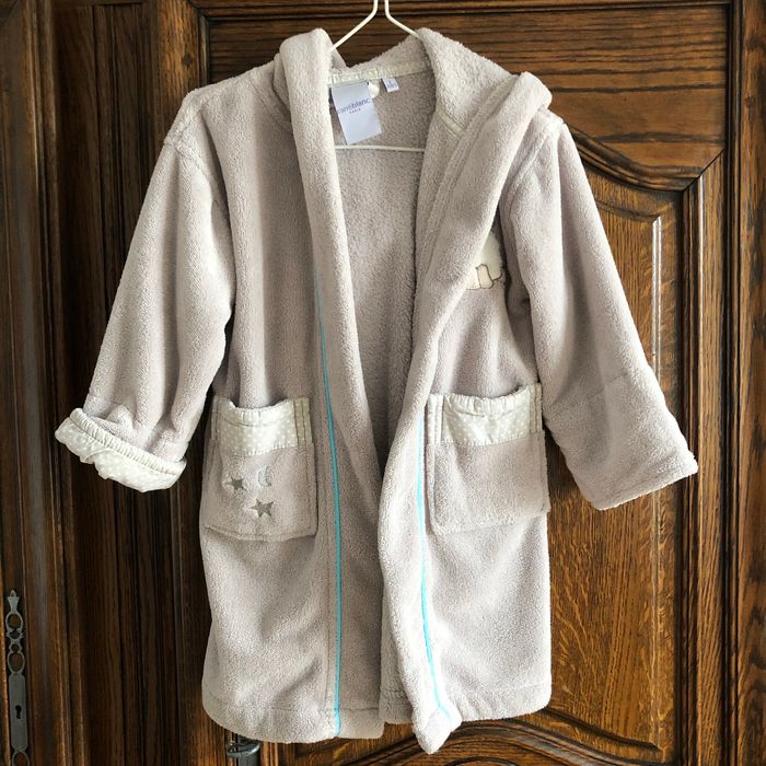 Robe de chambre beige foncé pour garçon ou fille indiquée deux ans Mais peuvent facilement être utilisé jusqu’à quatre ans Elle est de marque carré blanc, très douce et a très peu servi car double emploi : cadeau d’une autre couleur.