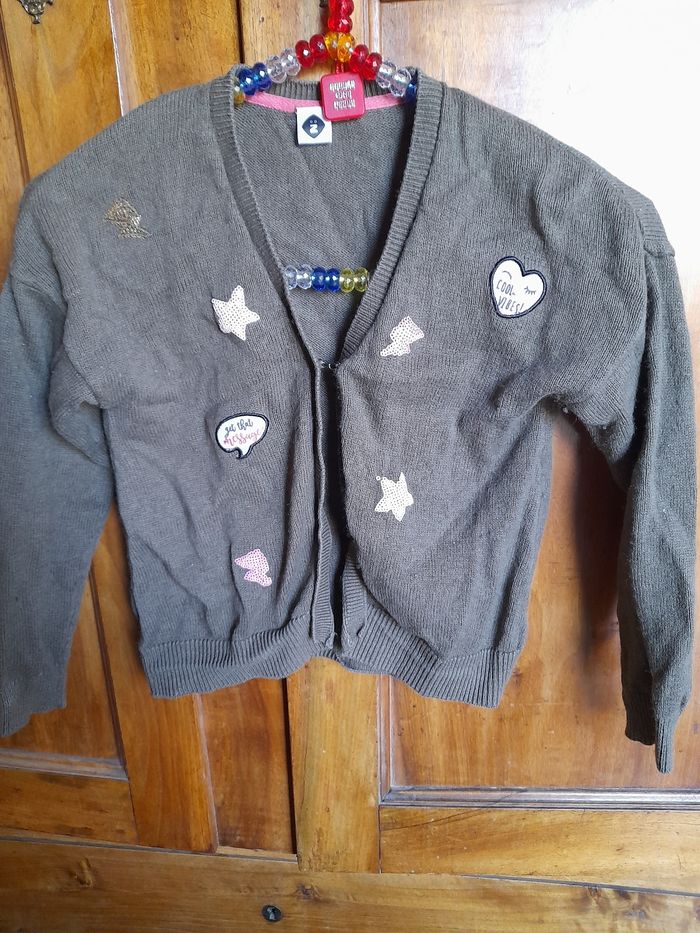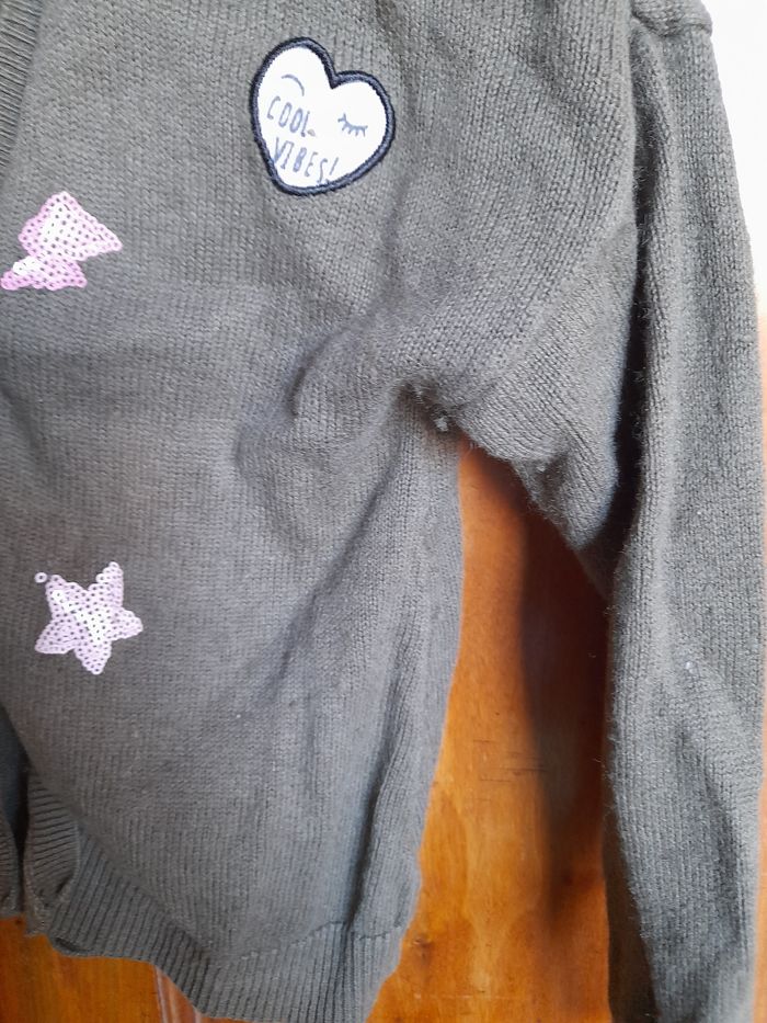 Porté mais encore en bon état rose . Bouloche un peu. Je donne le gilet kaki car peut encore servir mais beaucoup de bouloches et étiquette de la taille coupée...