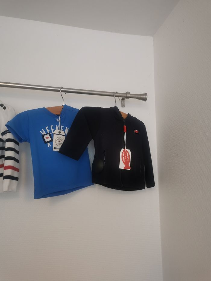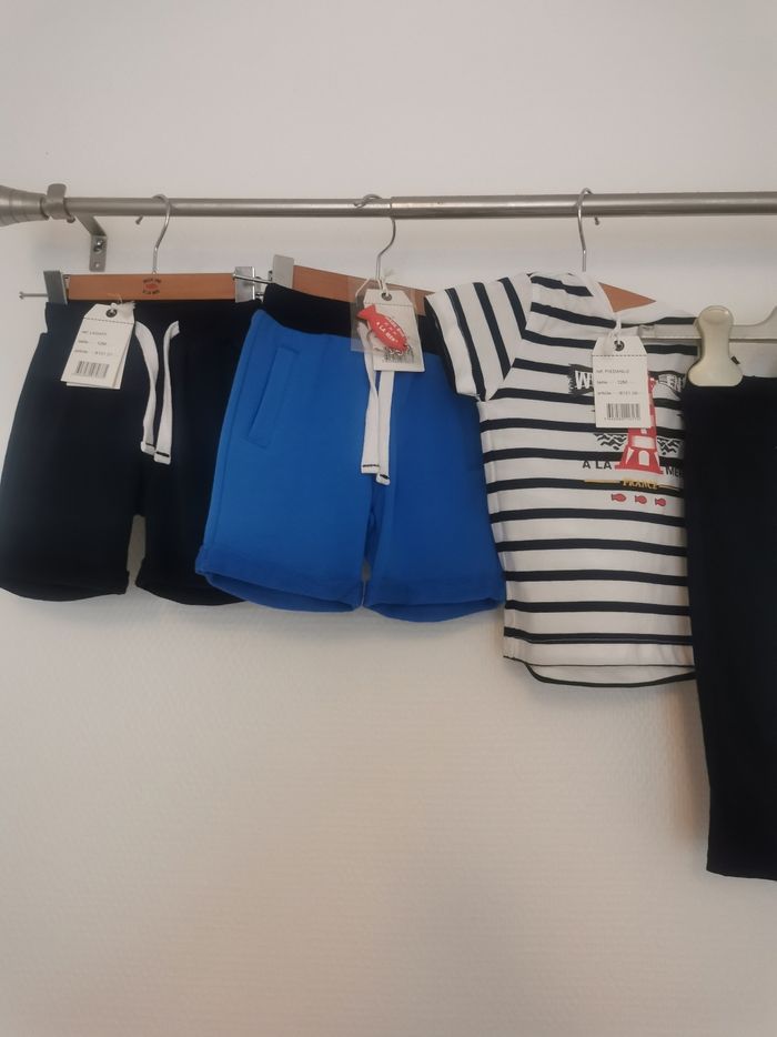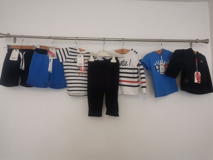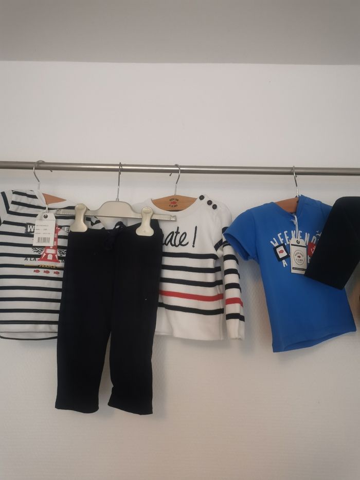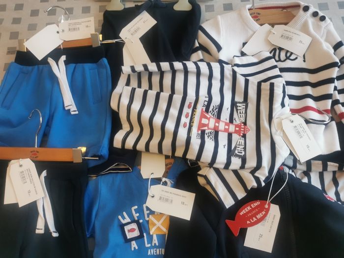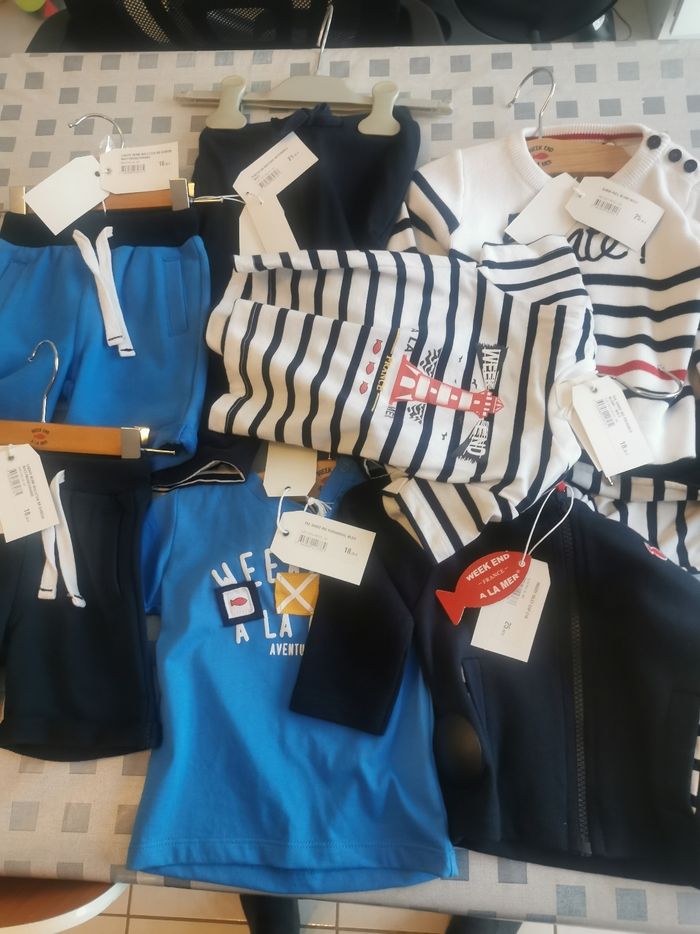 Lot de vêtements pour enfants Comprends 1 veste gilet, 2 tee-shirts, 2 shorts, 1 pull, 1 pantalon. C'est un lot de vêtements 18 mois Marque week end à la mer. Très bonne qualité Neufs Plusieurs tailles et modèles disponibles