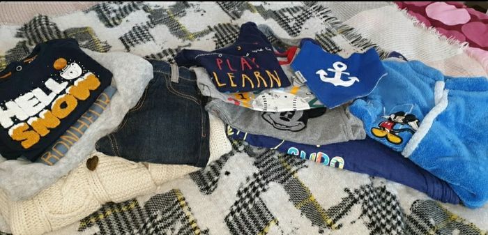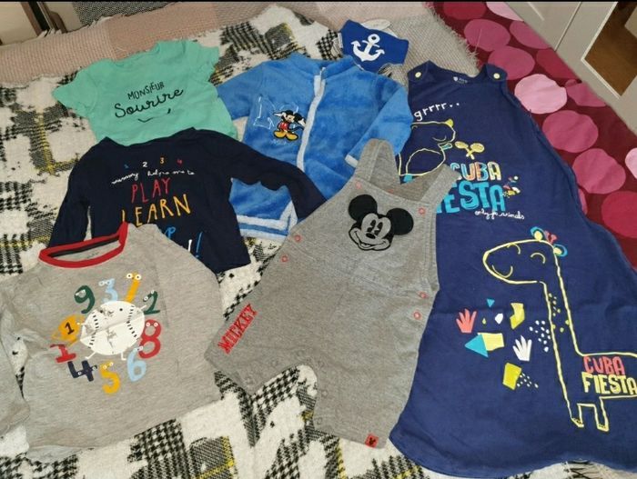 Vends un lot garçon en 9 et 12 mois, qui comprend : 9 mois 2 tee-shirts manches longues 1 jean 1 pyjama velours 1 manteau laine 12 mois 1 gigoteuse d'été 2 tee-shirts manches longues 1 tee-shirt manches courtes 1 robe de chambre Mickey 1 salopette courte Mickey