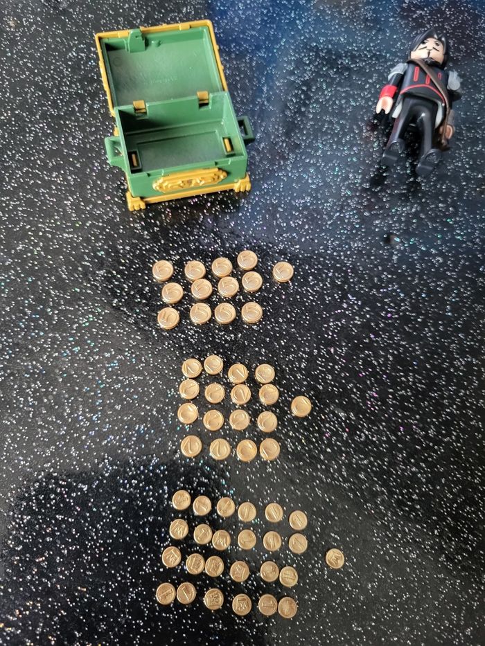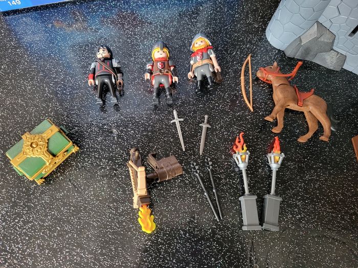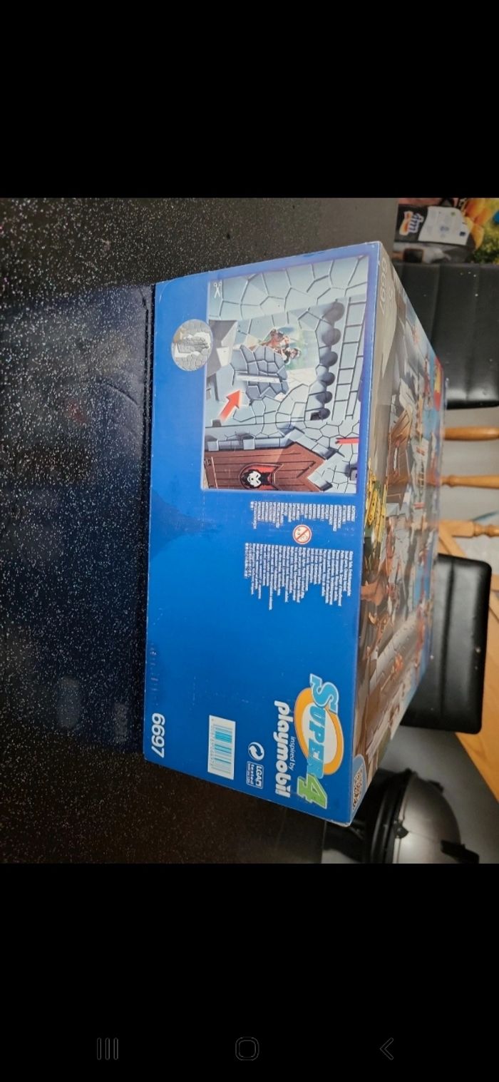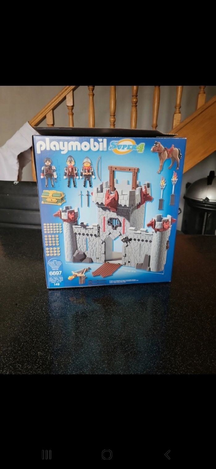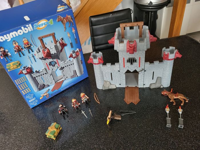 Playmobil super 4 6697 complet, dans sa boîte. Il y a une pièce de 5, une pièce de 2 et une pièce de 1 supplémentaire dans le Coffre. Boite un peu abîmé voir photo. Et une petite tâche sois la boîte. Le château et les accessoires sont en parfait état. Prix d achat 100€.