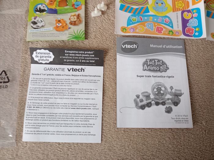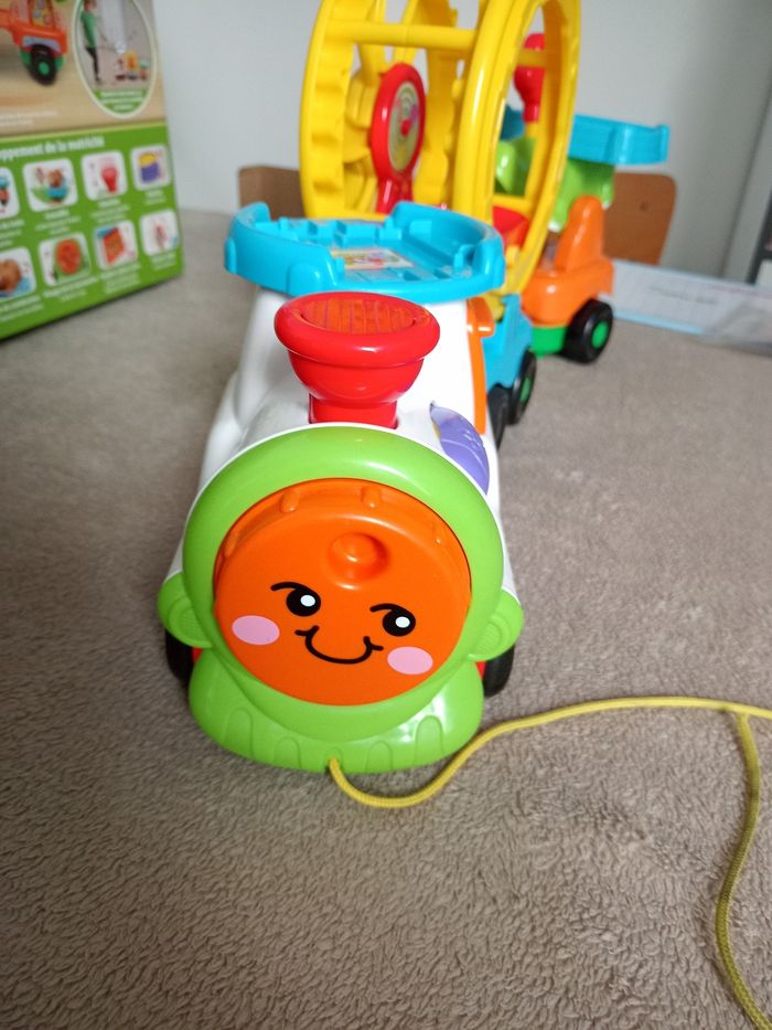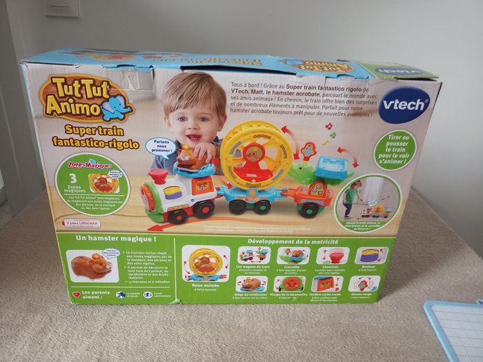 Train fantastico rigolo VTech, il a servi quelques temps mais pas longtemps, il comporte des petites trace du à cet utilisation, marque et ficelle tâché. Le hamster ne sera pas vendu avec car mon fils ne veux pas le quitter il l'aime trop. Le carton est en bon état, il y a les vis d'attache pour pouvoir remettre un tut tut animo, il y a aussi des autocollants et la notice.