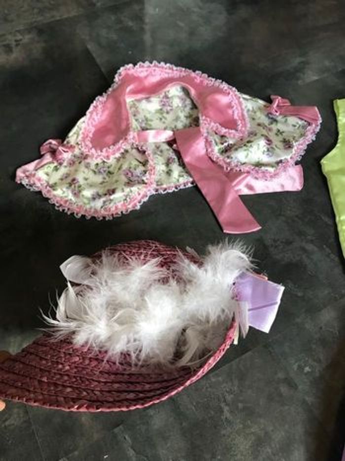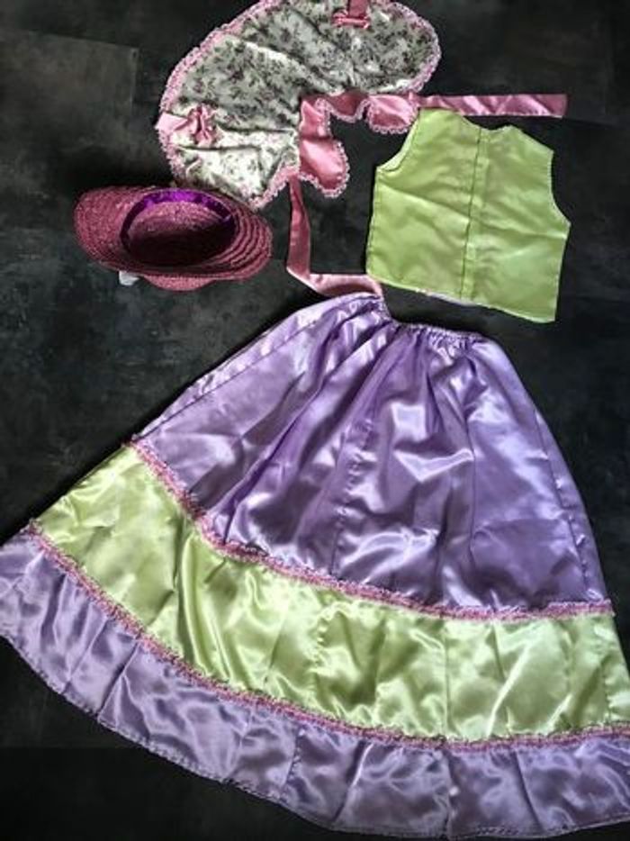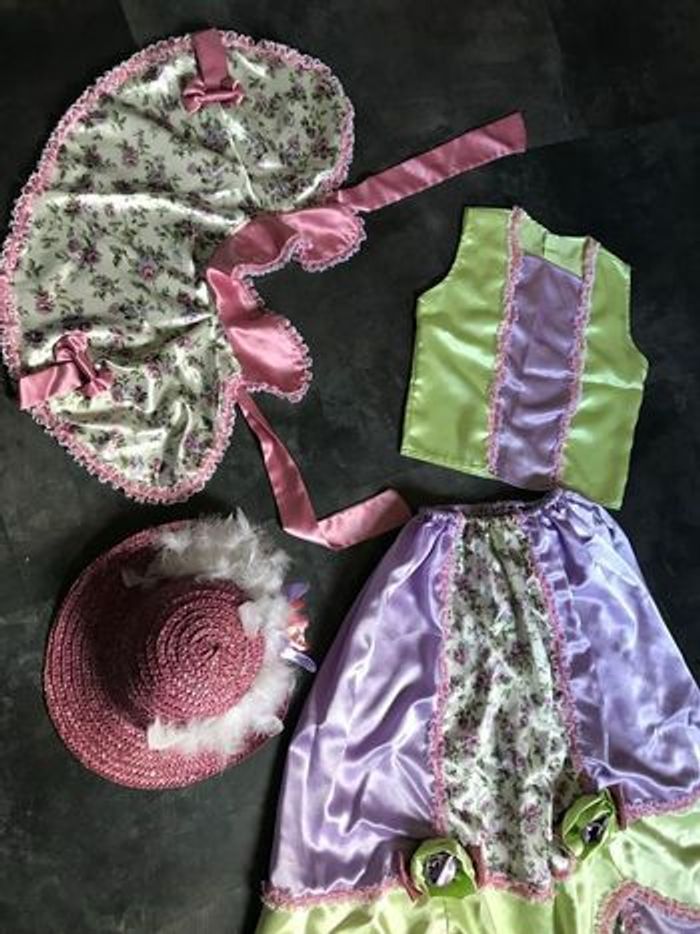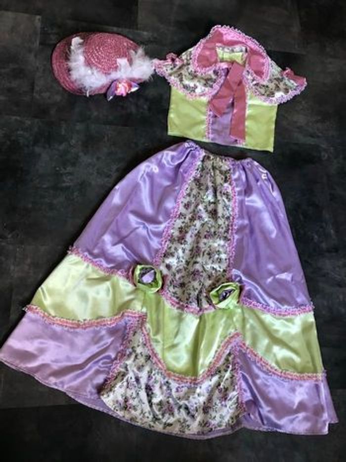 Vends très jolie panoplie costume déguisement Caroline du sud, 3 articles tout en satin en très bon état, petite fille modèle, romantique , costume colonial, Nelly dans la petite maison dans la prairie. le chapeau est en bon état Plus ou moins une taille 10 Ans. Taille de la jupe élastique. Longueur de la jupe 84 cm. Le haut mesure à plat sous les bras 40 cm. La carrure fait 29 cm.
