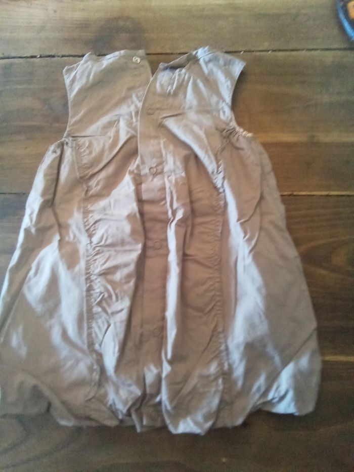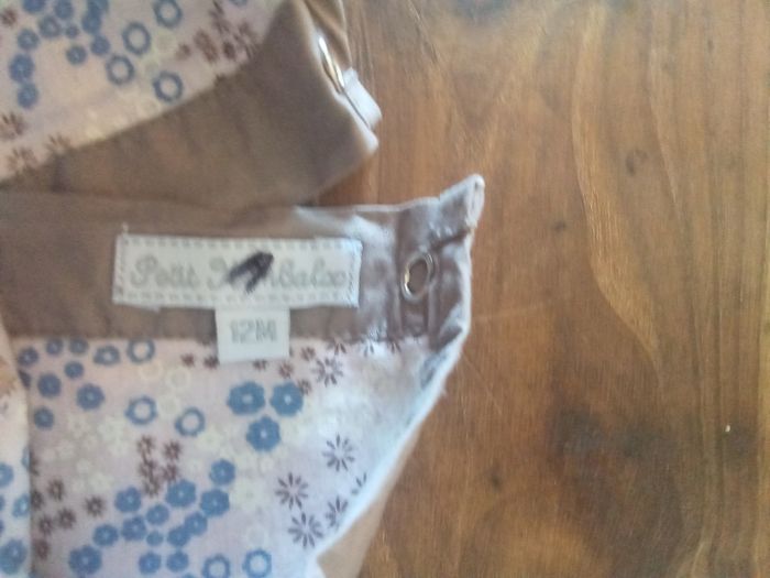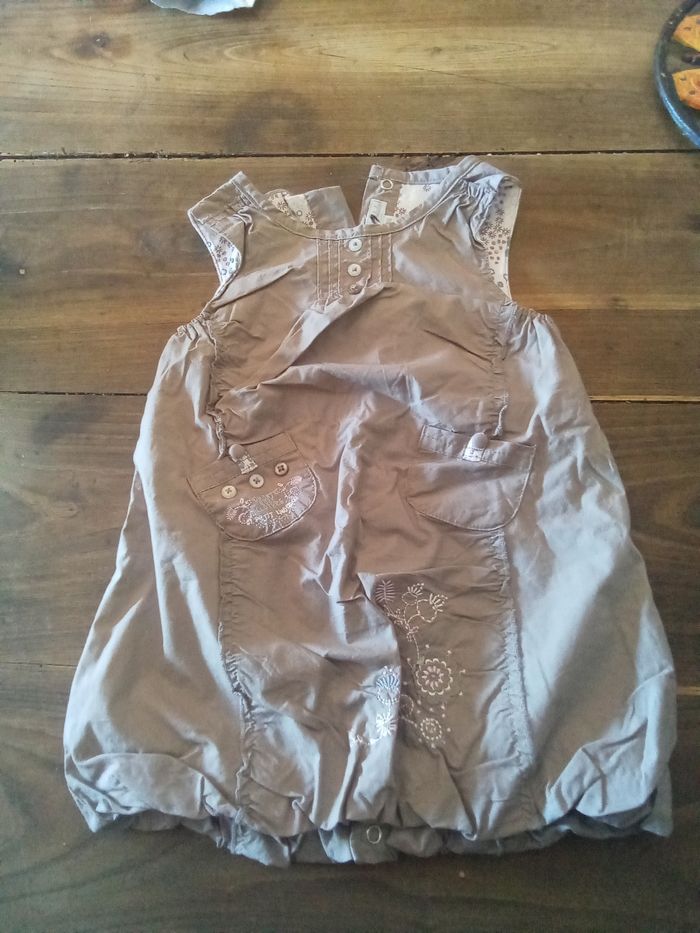 Robe couleur taupe avec broderies roses . 12 mois . Petit kimbaloo. Excellent état sauf une initiale note sur l'étiquette.