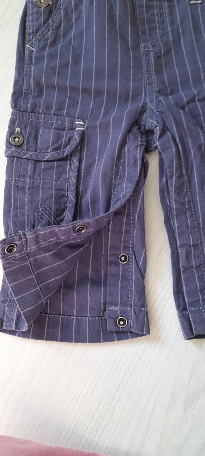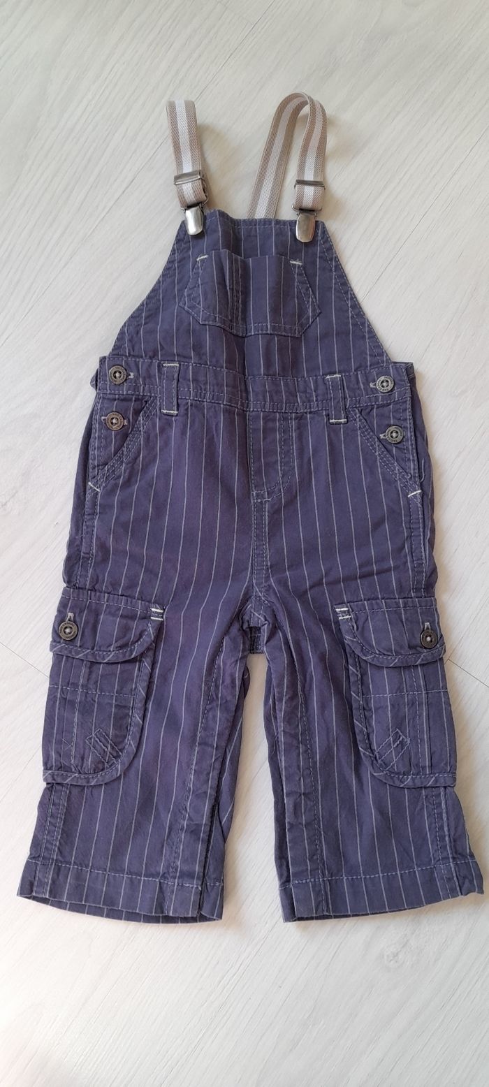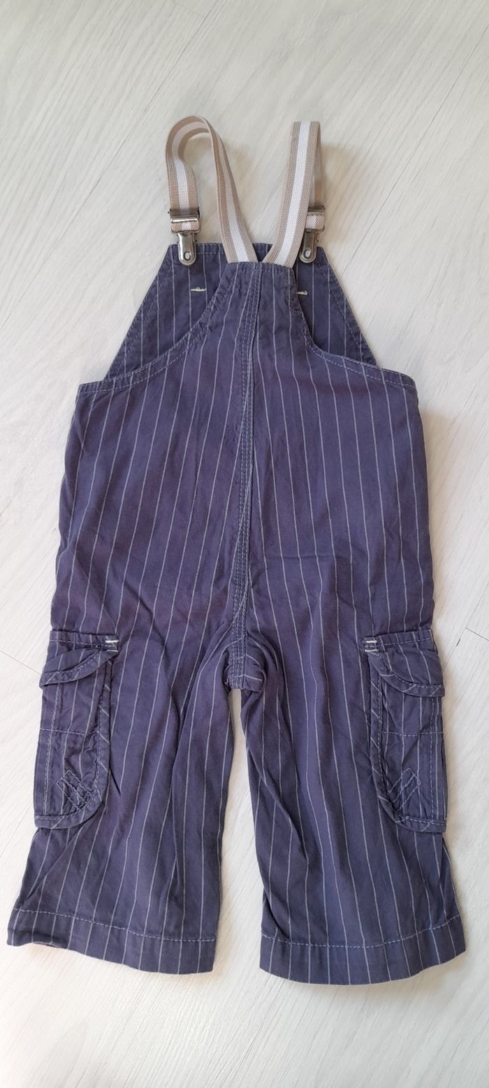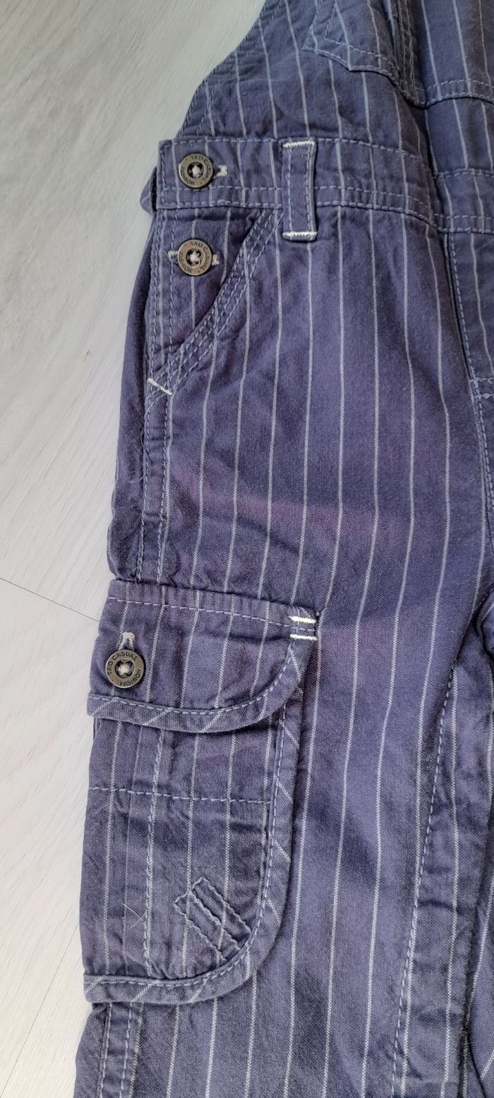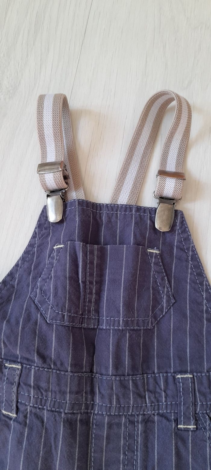 Salopette T 6 mois Marque TAPE A L'ŒIL Couleur bleu 2 poches devant 2 poches avec rabat sur jambes Passants pour ceinture Attache pressions entre jambes et boutons sur côté de la taille Bavette avec poche Bretelles élastique réglable Très très bon état
