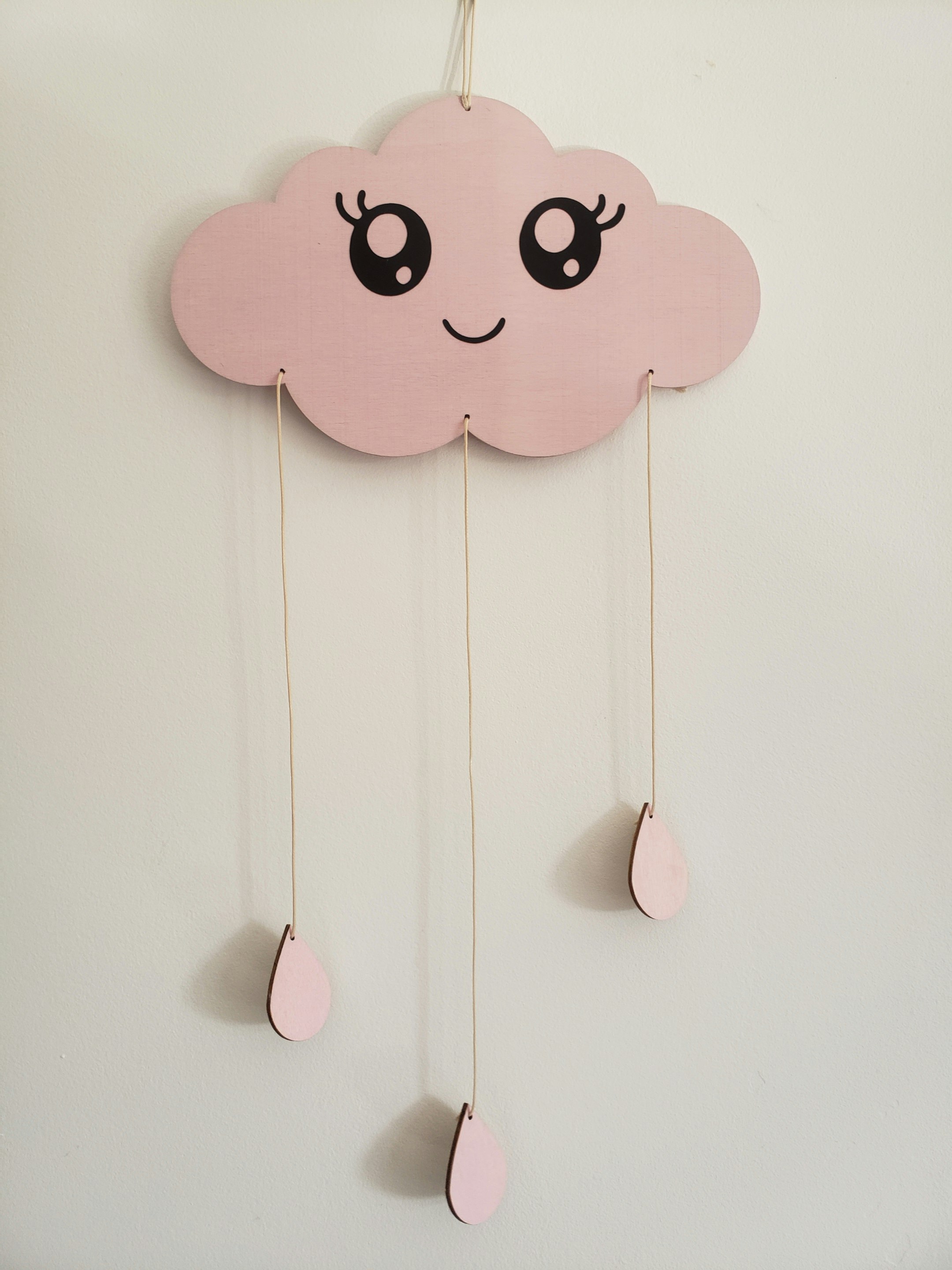 Pêle-mêle en bois en rose. Le format du nuage est de 25 cm largeur et 15 cm hauteur. Le Pêle-mêle avec les cordelettes font 45 cm de longueur, en forme de gouttes d'eau avec une pince en bois derrière pour accrocher vos photos. Possibilité de personnaliser votre prénom sur simple demande.