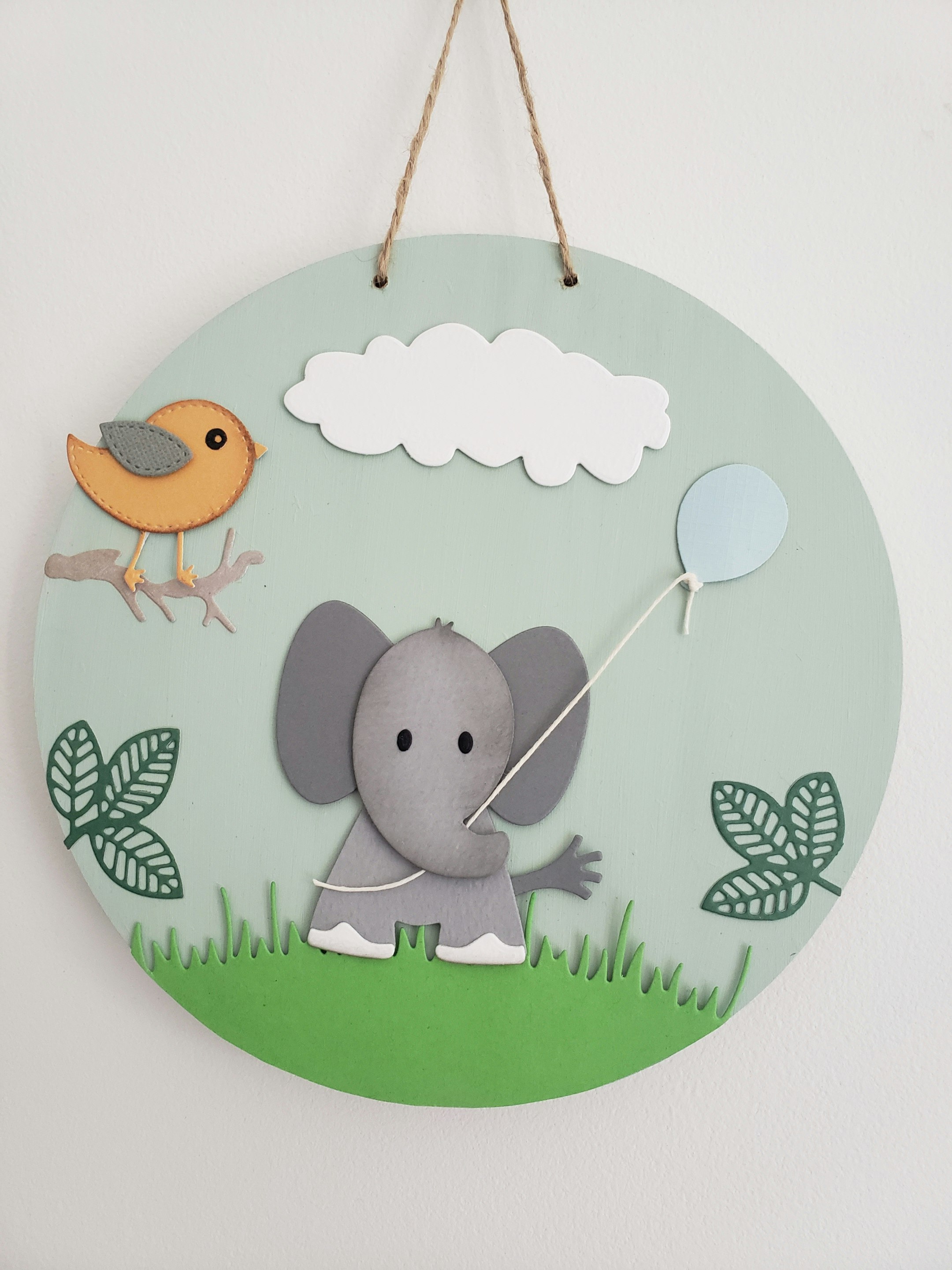 Rondelle en bois de 18 cm. Porte prénom fait main sur le thème éléphant. Le fond a été peint en acrylique vert pastel. Réalisation en papier avec un petit oiseau et un éléphant avec son ballon en relief. Possibilité de personnaliser avec votre prénom sur simple demande. Avec accroche derrière.