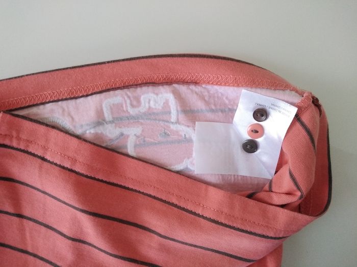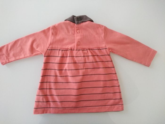 Robe manches longues, ou sweat-shirt long ou blouse avec col 3 boutons au dos Couleur corail, avec rayures marron Plus l'étiquette pour identifier la marque Il y a encore des boutons de rechange Très bon état, très peu porté