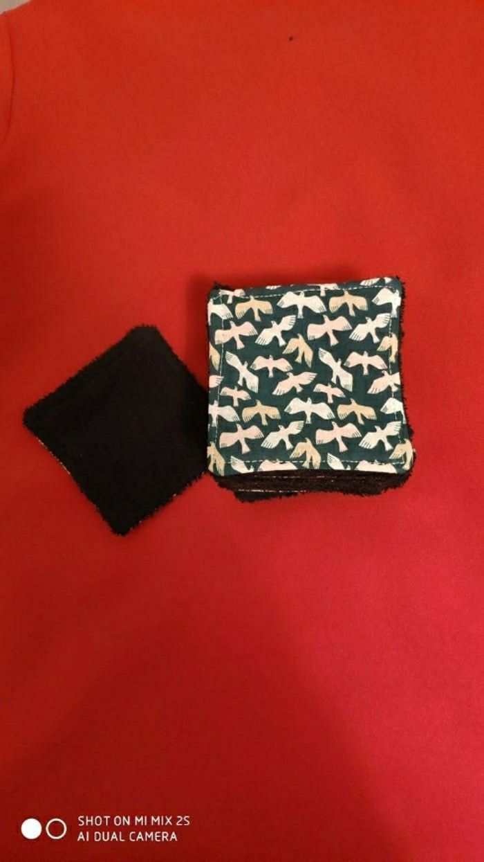 En tissu eko-tex français et éponge bambou noir, 10 X10 cm, pour les mamans et les bébés 😀.