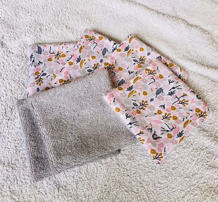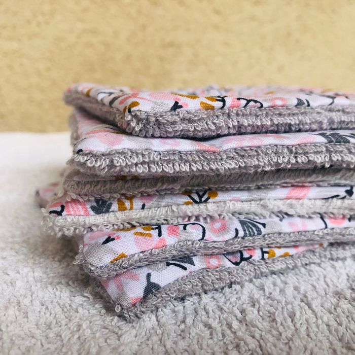 Lot de 6 cottons/lingettes neuf Un côté motif fleuris L’autre doux parfait pour se démaquiller ou pour les enfants Se lave très facilement en machine Fait-main par ma mère ancienne couturière Lot de 12 disponible à 9€