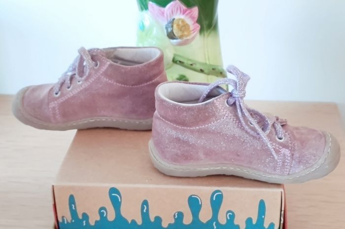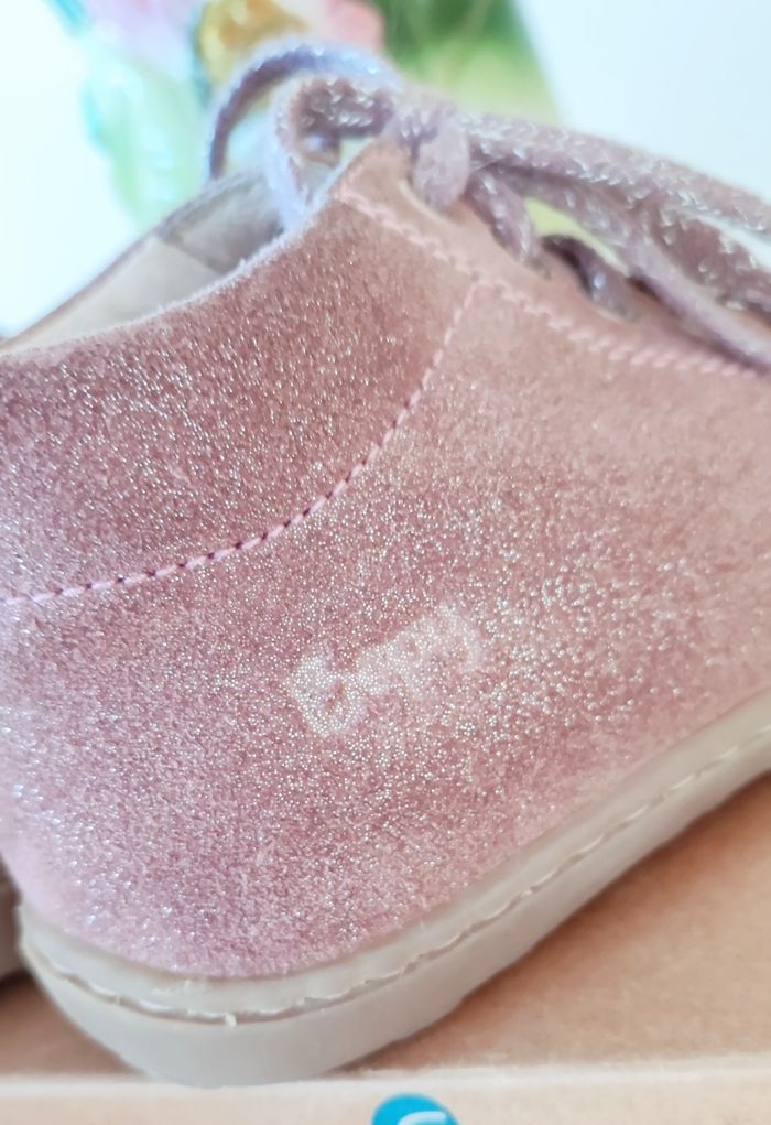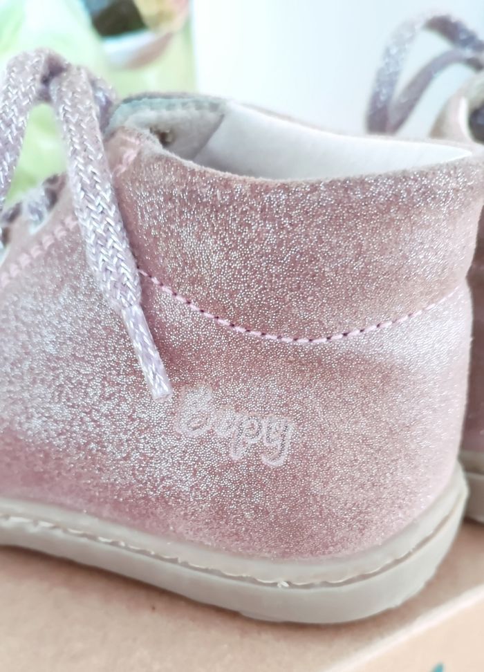 • Bottines Jetrote de la marque BOPY - Vieux rose pailletée - A lacet - Matière : Cuir - Pointure : 23 (semelle intérieure : 14,3 cm) ✓ Maintient très bien le pied idéal pour les premiers pas ⚠️ Vendu sans boite d'origine ⚠️ ❌ Excellent état juste des petites marques sur le haut intérieur dû au frottement entre chaussures et la semelle intérieur en cuir qui a des marques du fait qu'elles ont été portées. Le reste est comme neuf