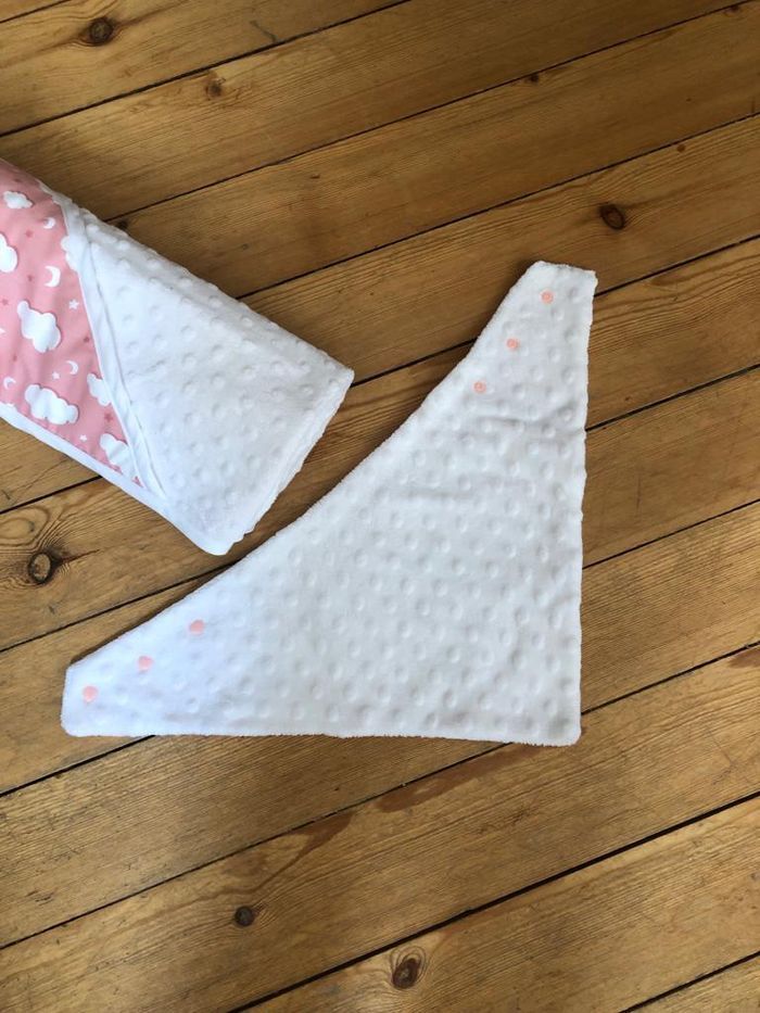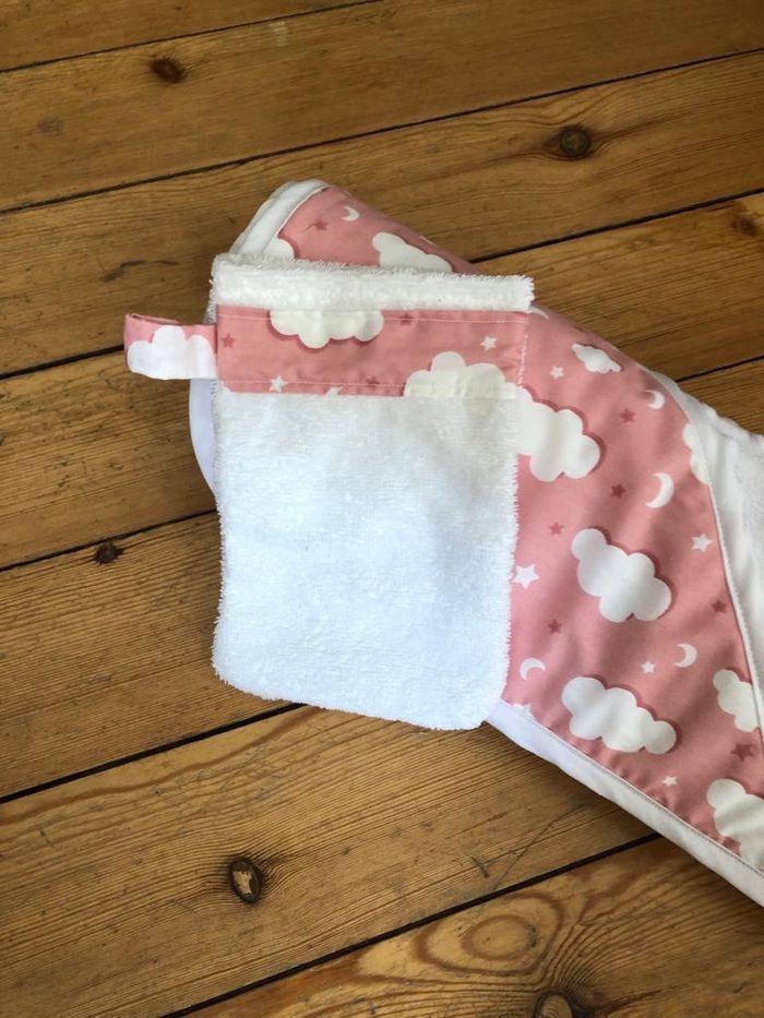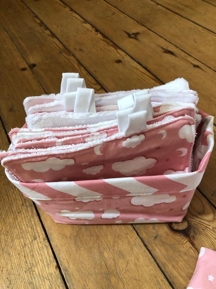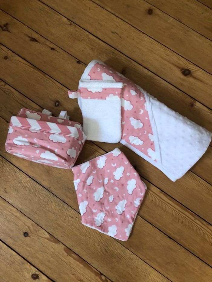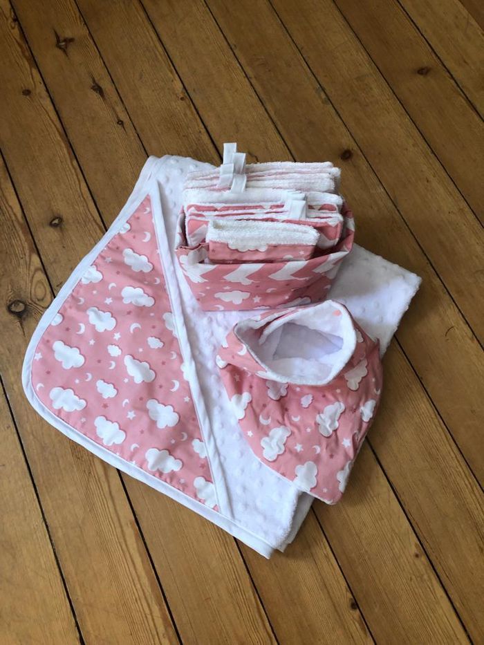 Je mets en vente cet ensemble de naissance qui inclut - cape de bain 80/80 - 10 lingettes lavables 15/20 avec leur panière - un bavoir triangle - un gant de toilette