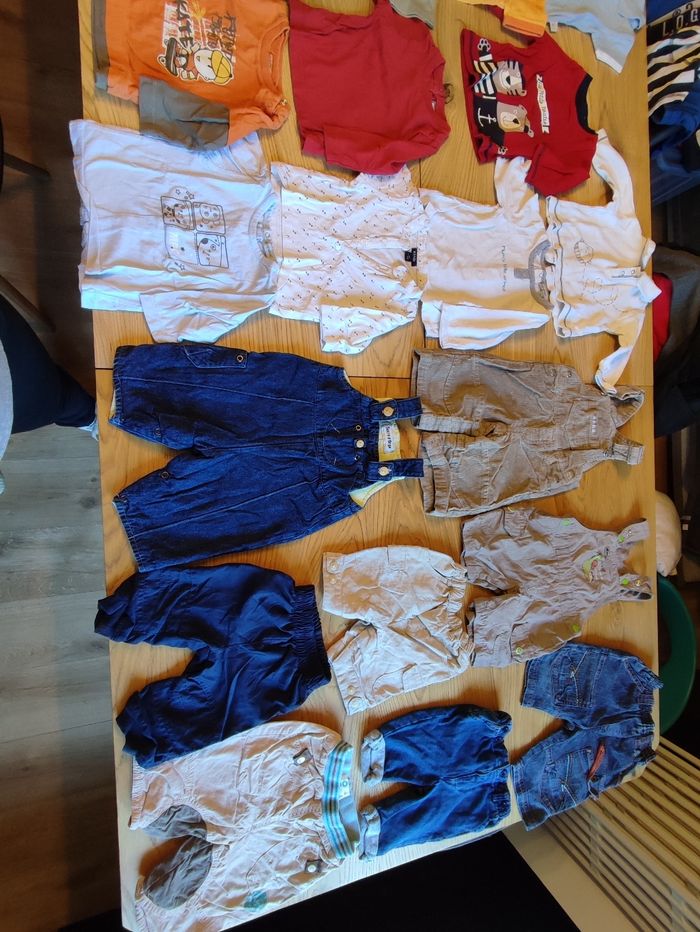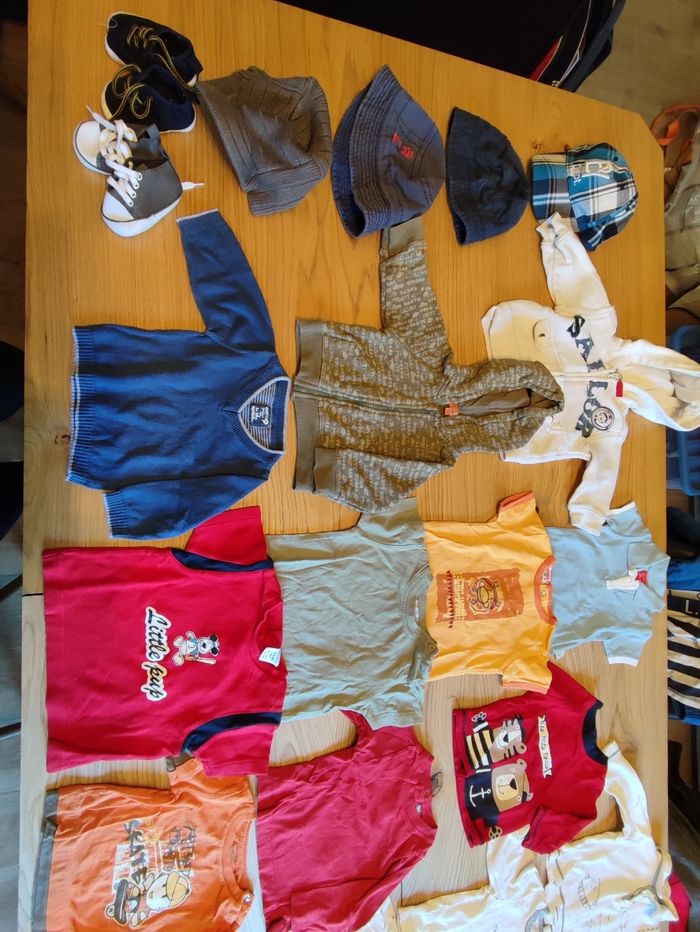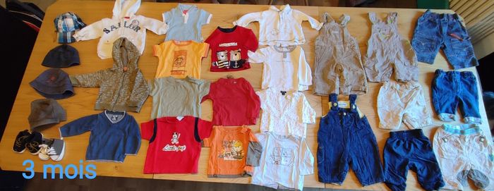 Très bon état, pas de tâches. 3 mois, toutes marques. Comprends : - 2 paires de chaussures comme neuves - 4 t-shirts - 7 t-shirts manches longues - 2 gilets à capuche - 1 pull - 5 pantalons - 3 salopettes - 2 bobs - 1 casquette - 1 bonnet casquette hiver