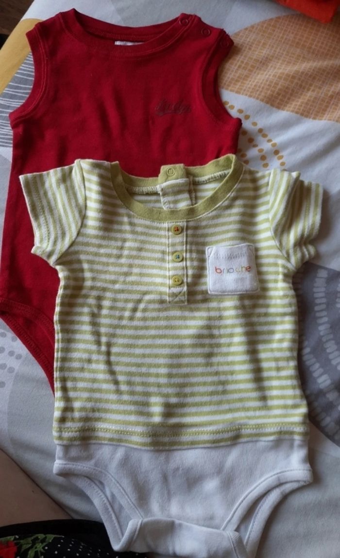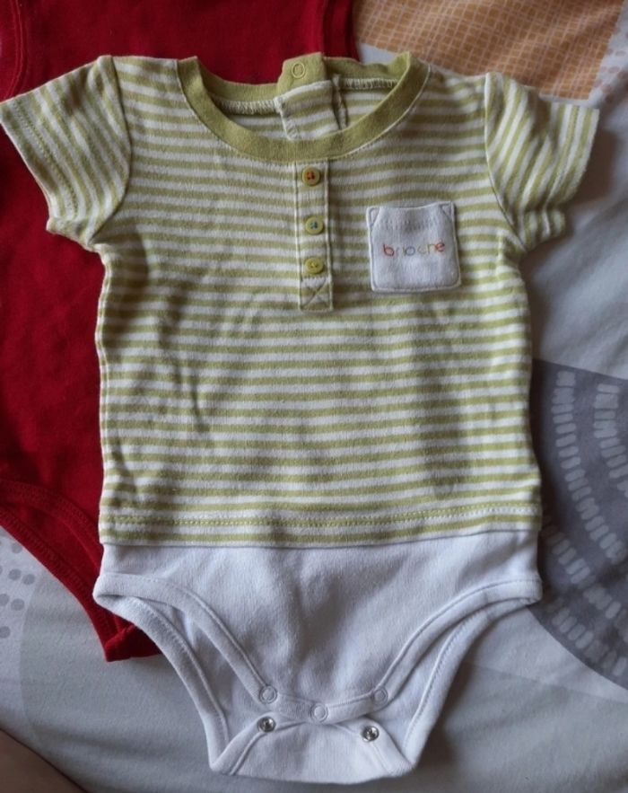 Body rouge sans manche : marque La Compagnie des Petits, ouverture pressions épaule Body rayé vert et blanc, marque Brioche, ouverture dos pressions, légèrement bouloché Très bon état général
