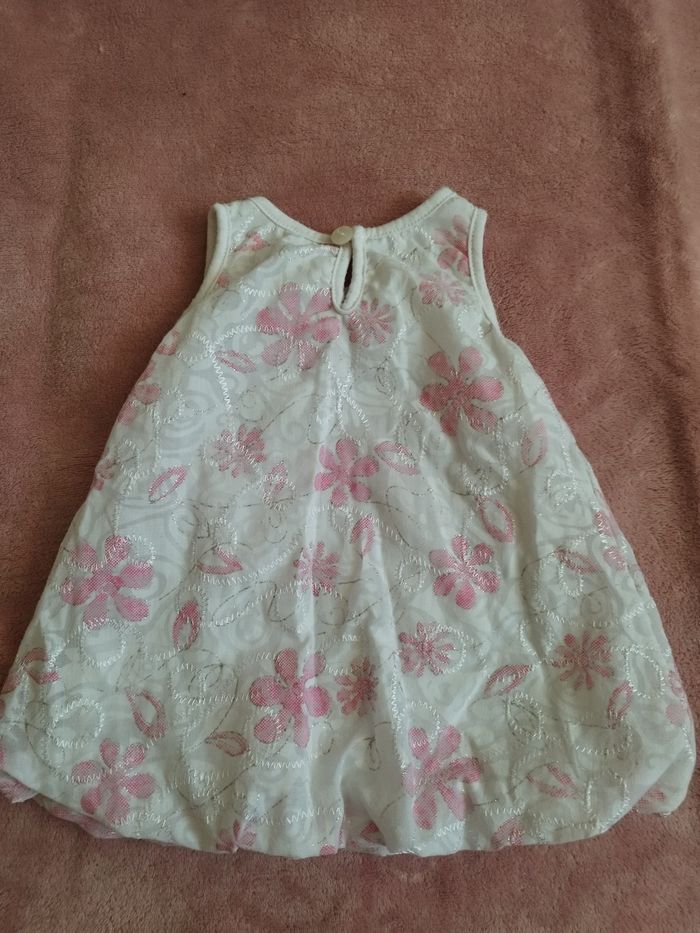Robe blanche avec des fleurs roses et des détails blancs et argentés. L'argenté est pailleté