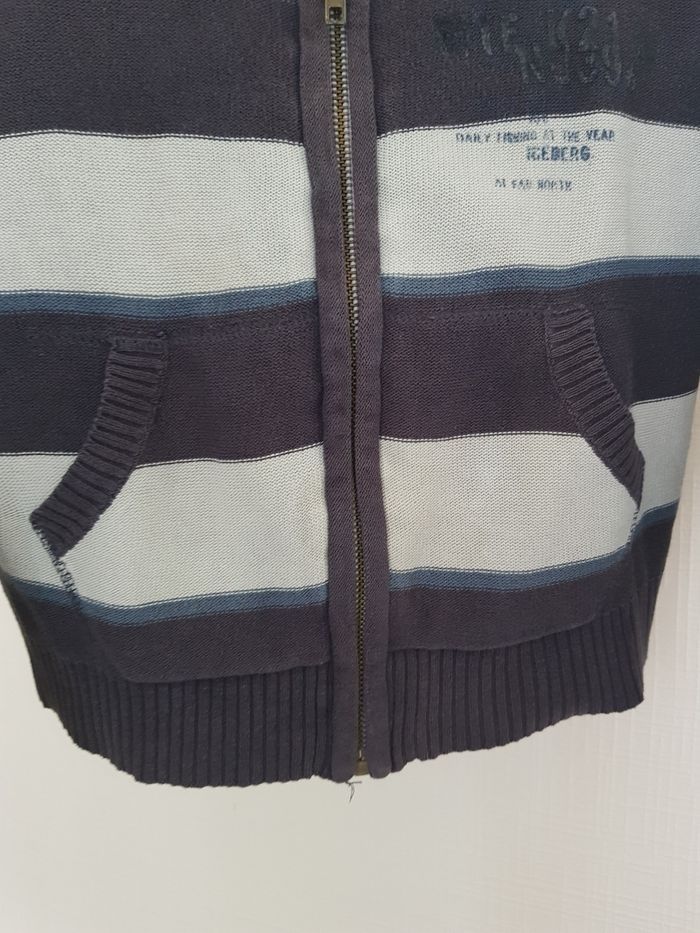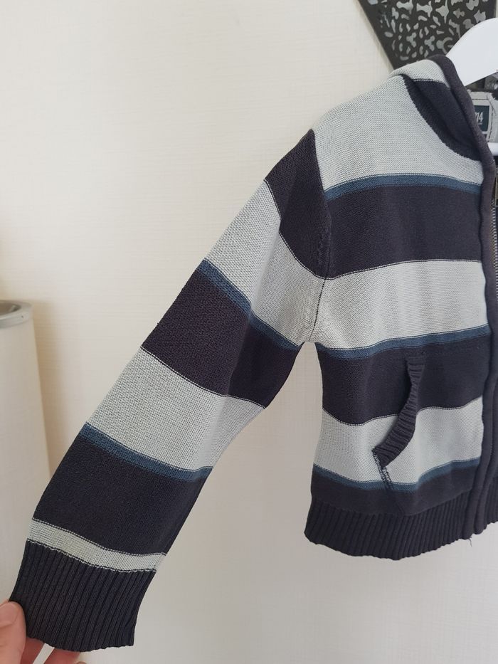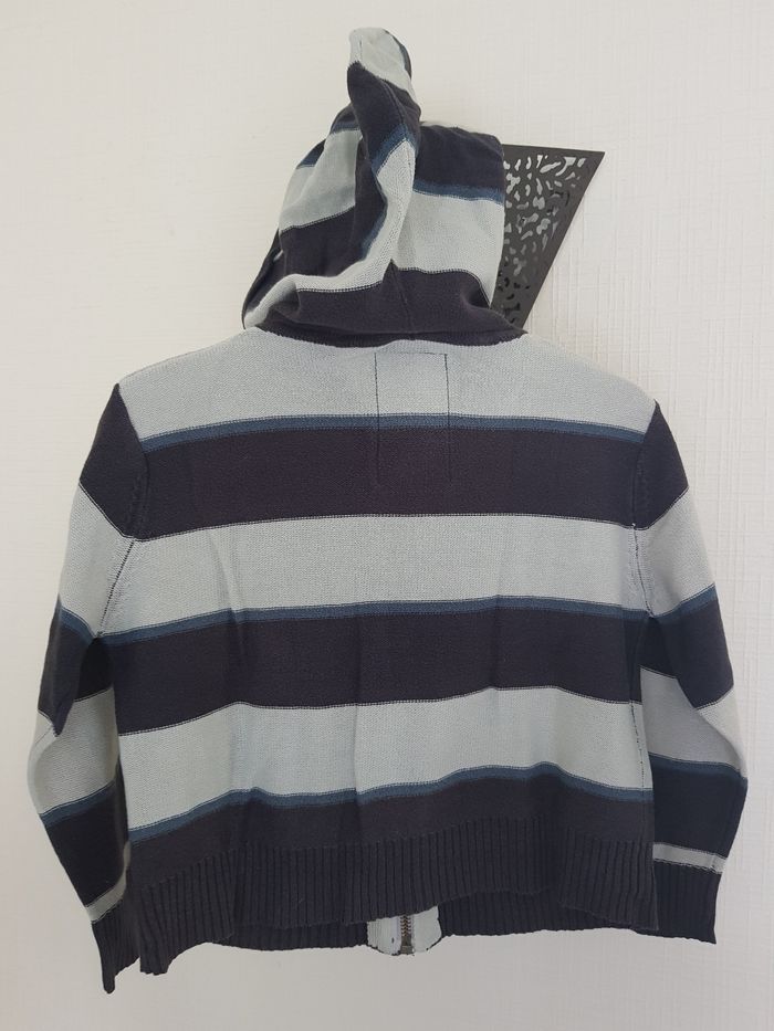 Veste à rayures avec fermeture éclair, capuche et 2 poches De la marque YCC en taille 3 ans Motif imprimé à gauche un peu passé et trace bleue sur le dos d'une manche