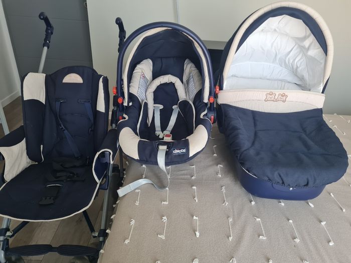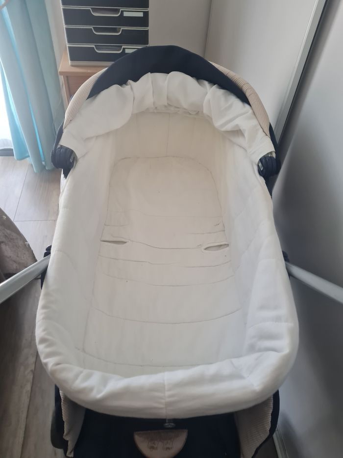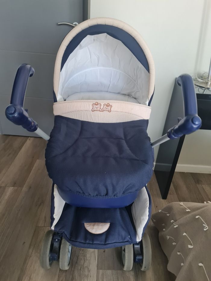 Très belle poussette trio nacelle cosy poussette bleu marine et beige très bon état très peu servie car était chez les grands patents ni déchirure ni tâche