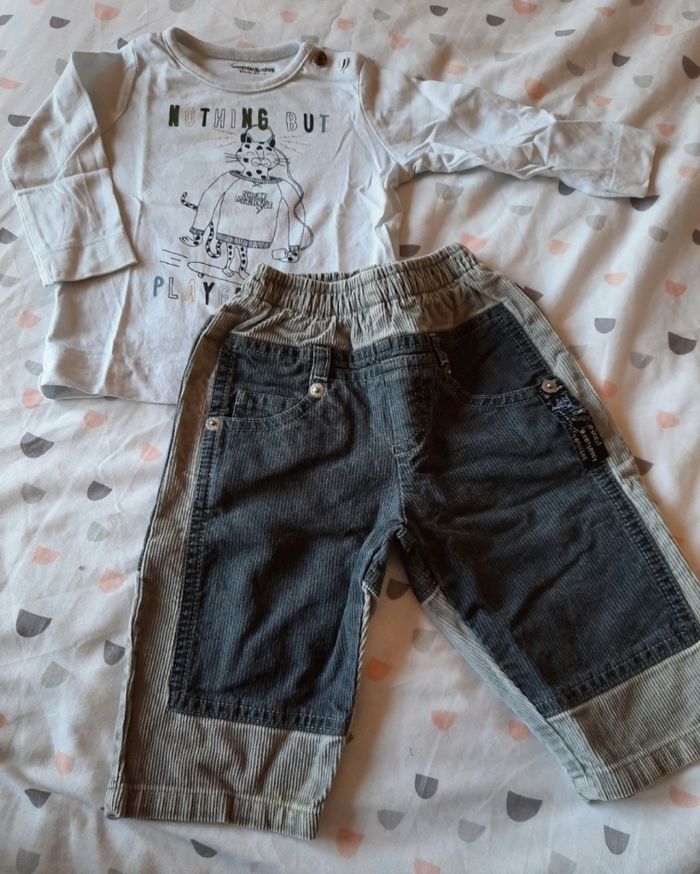 Lot comprenant : - un tee-shirt léger manches longues blanc avec motif skate - marque Vertbaudet - un pantalon bicolore en velours gris clair et effet velours noir - marque 3 Pommes Tout en excellent état car peu porté
