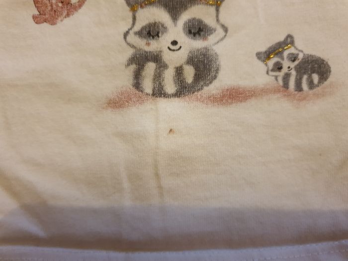 Taille 3 mois, état satisfaisant 2 petites taches, voir photo 3 et 4 Un point sur la guirlande du dessin s'est décollé