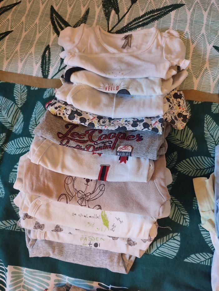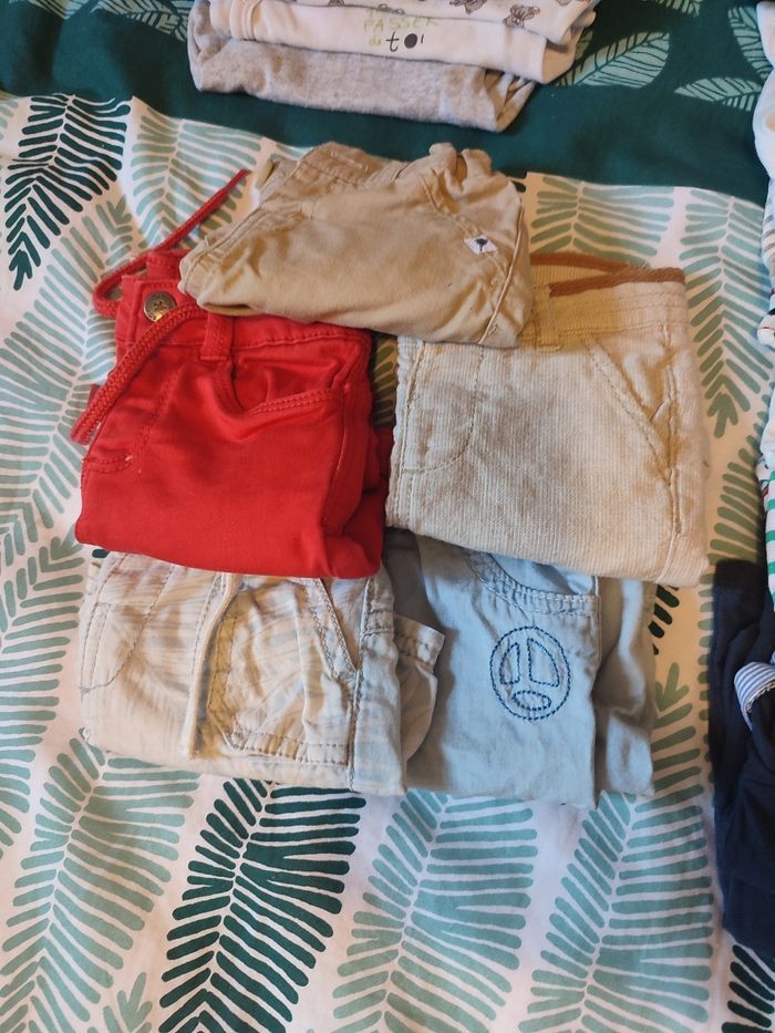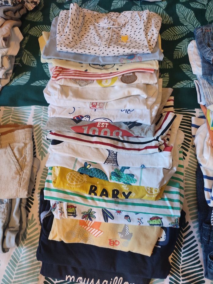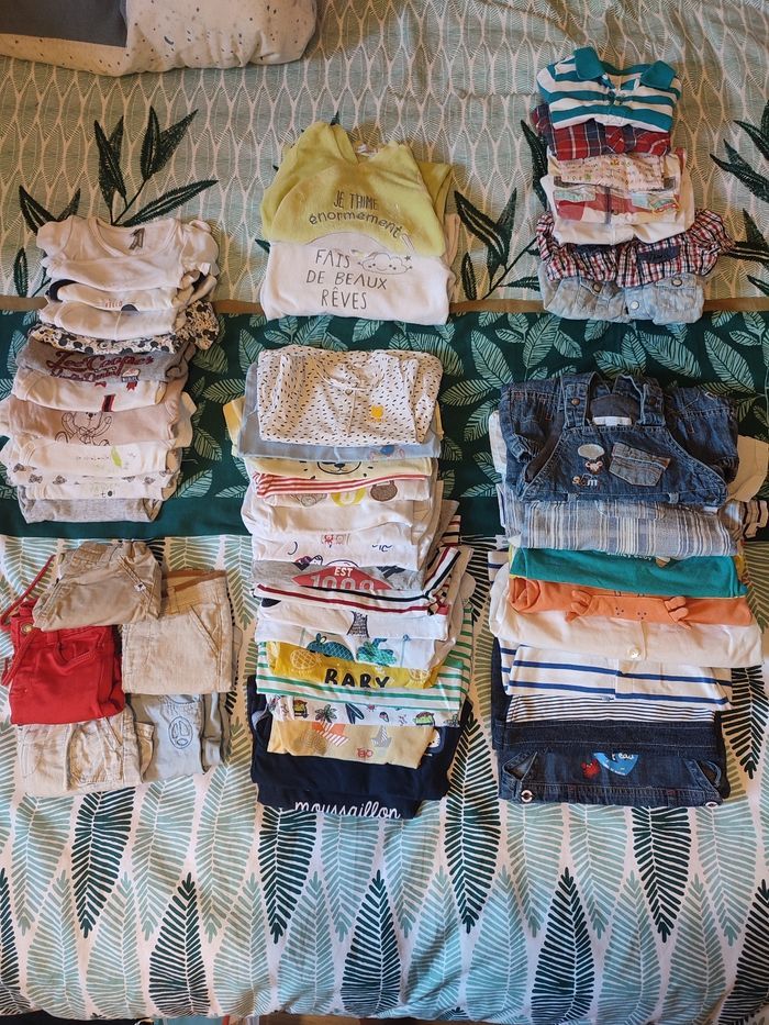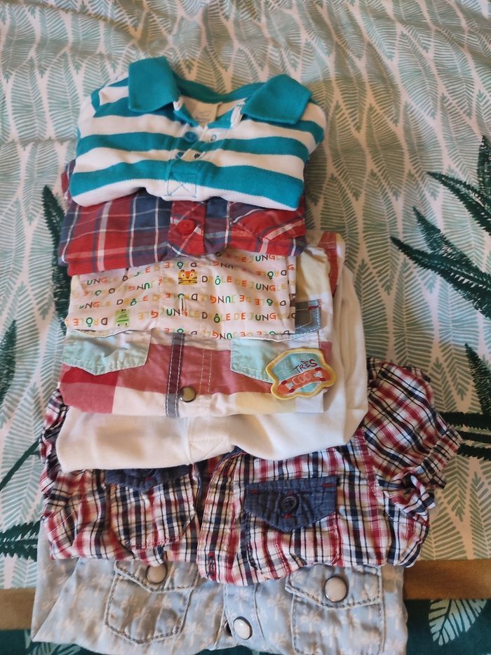Vent lot de vêtements 6 mois garçon été ou printemps ( sauf les deux pyjama en velours en haut de la première photo vert et blanc) Combishort/tee shirt /polo /chemise/bodies/short Beaucoup de marque différentes