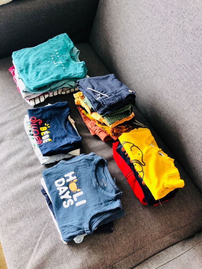 Je vends ce lot bébé 3 mois : - 6 bodys (marcel et manches courtes) ; - 3 pulls ; - 5 pantalons et 2 shorts ; - 5 pyjamas ; - 4 teeshirt. Toutes marques / Bon état