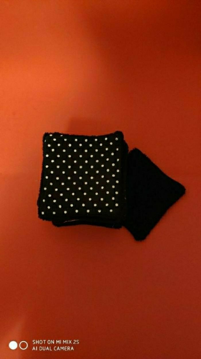 En tissu eko-tex français et éponge bambou noir, 10 X10 cm pour les bébés et démaquillante pour les mamans 😀.