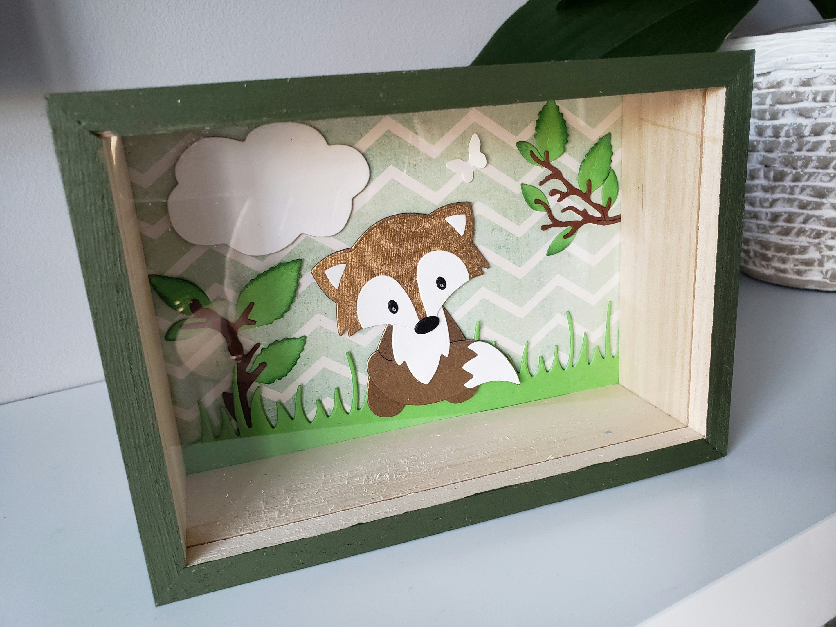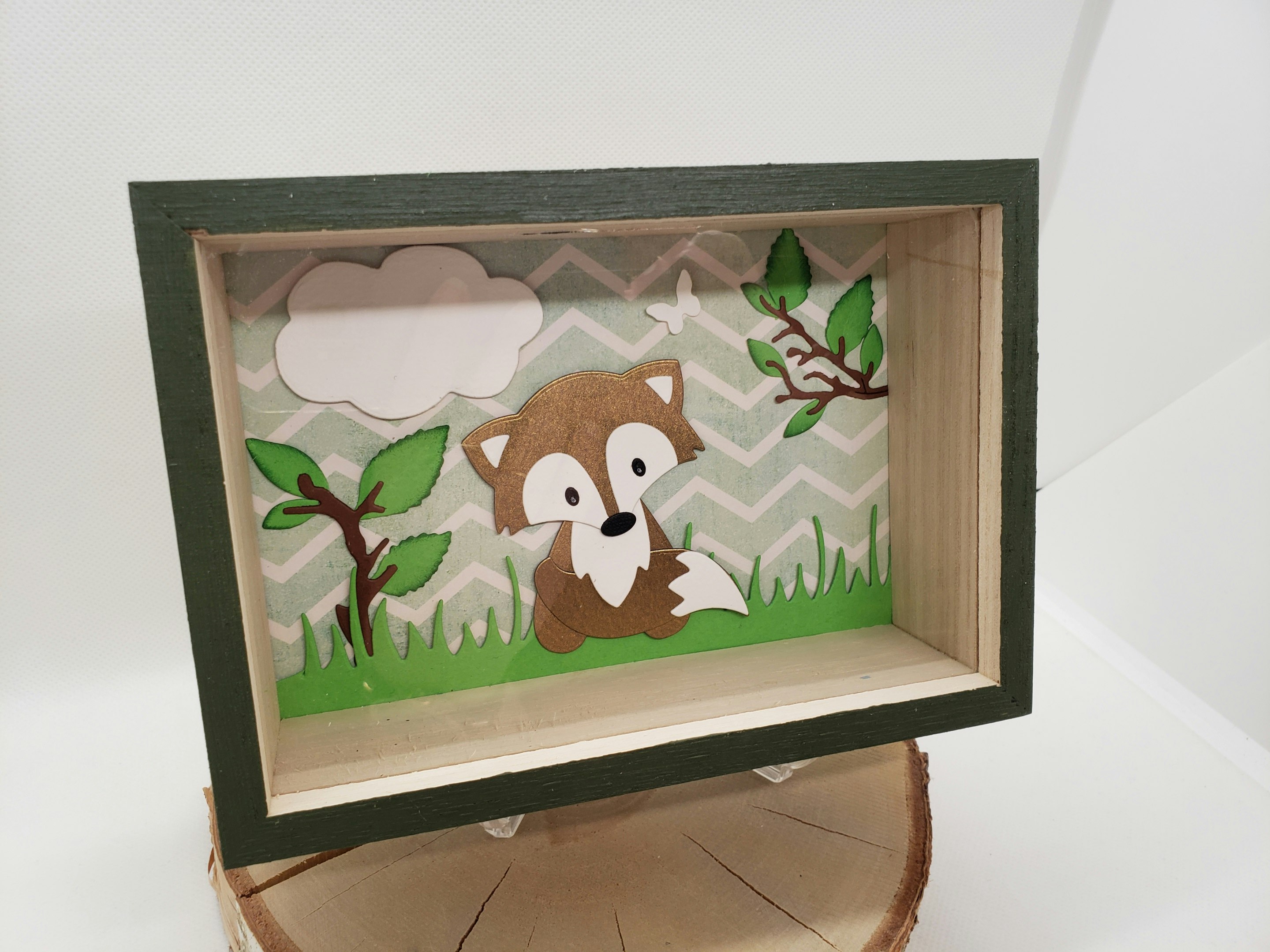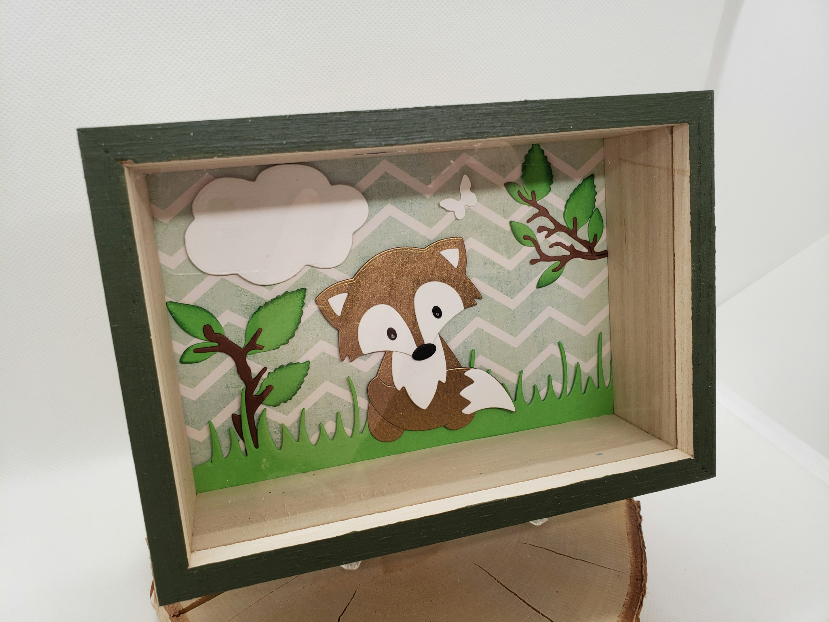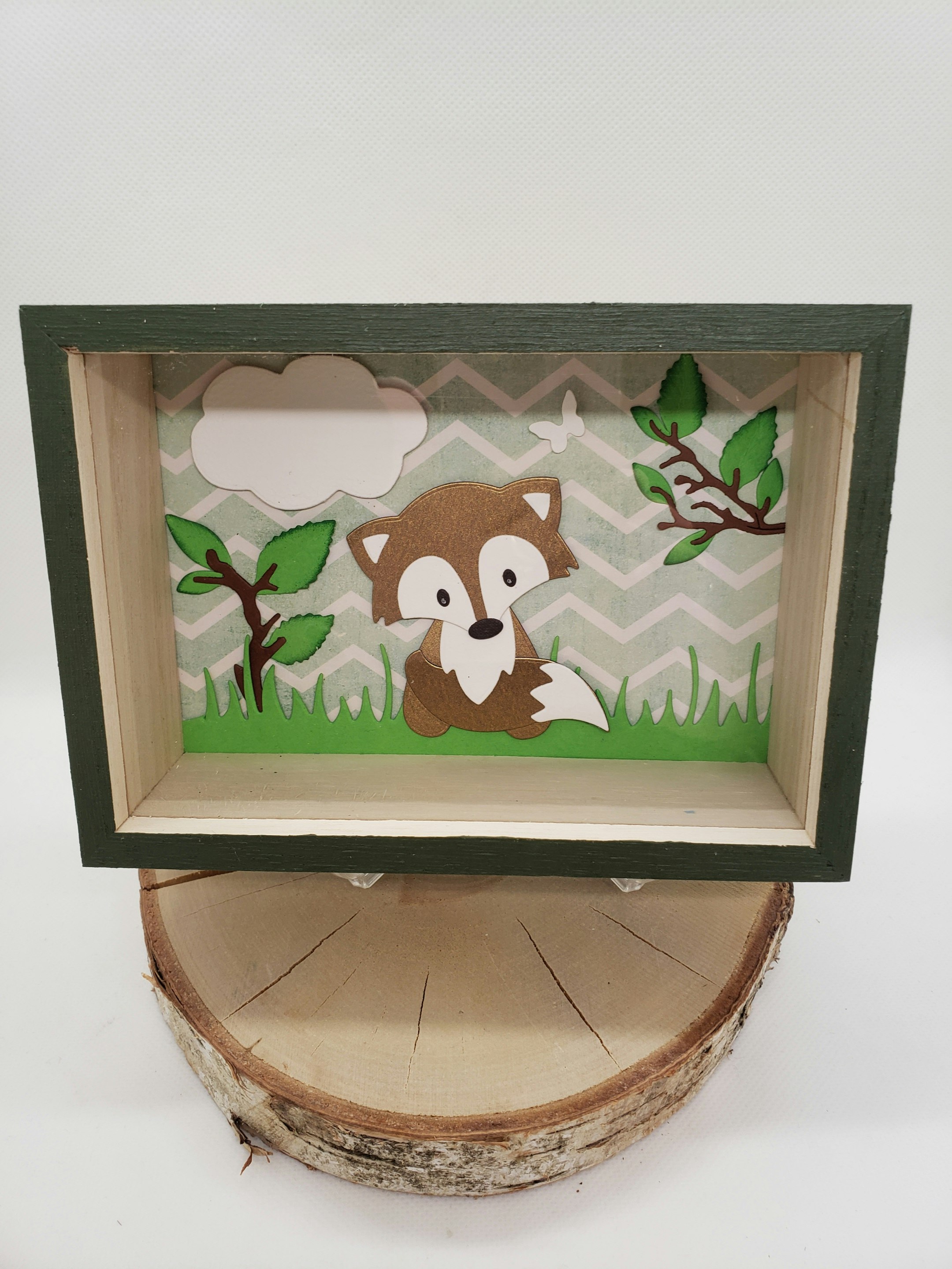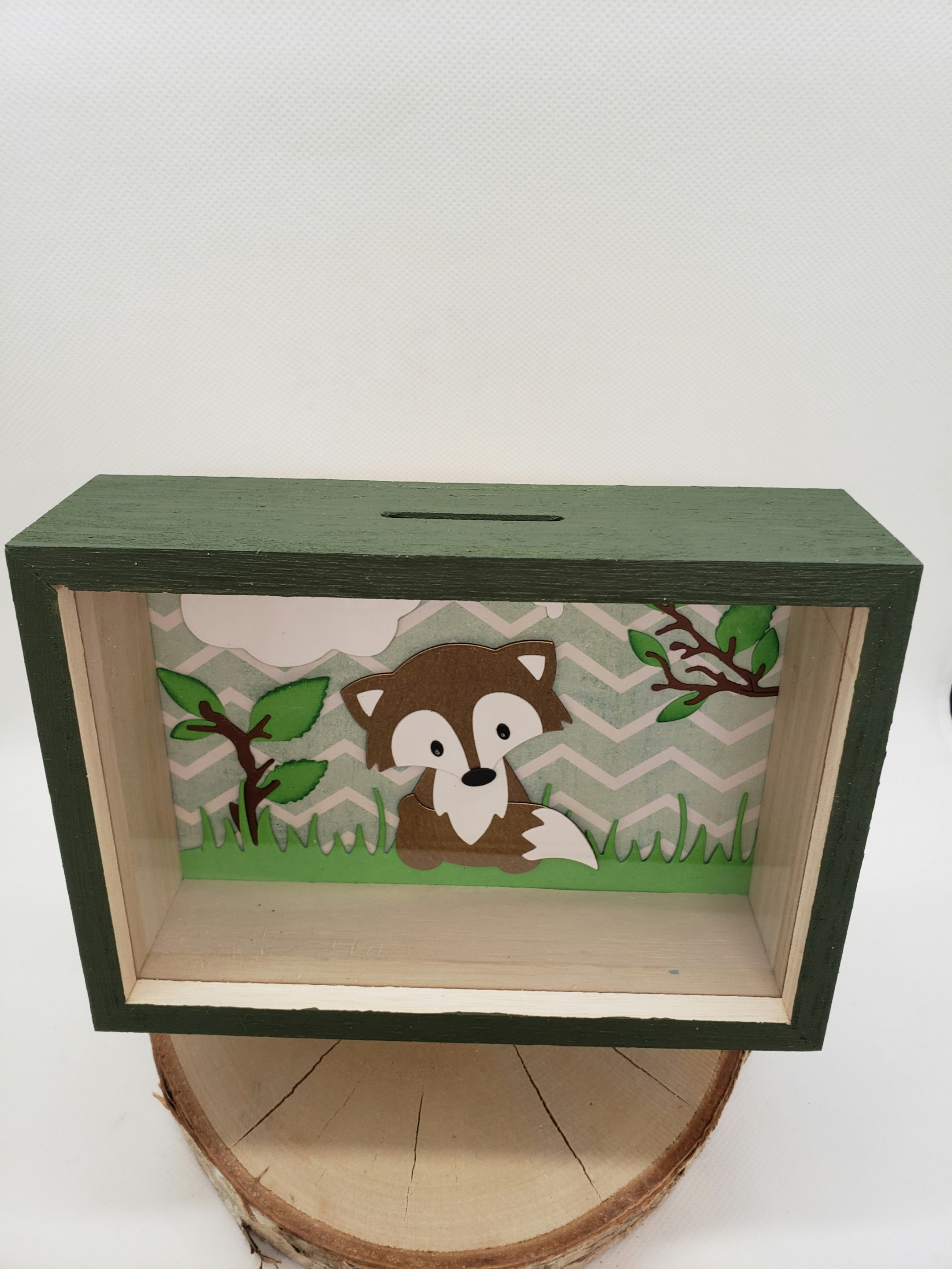 Tirelire fait main en bois. Taille 17x12. A l'intérieur un renard en relief sur un fond géométrique vert et blanc. Quelques branches marron avec un feuillage en relief. Possibilité de rajouter un prénom sur simple demande.
