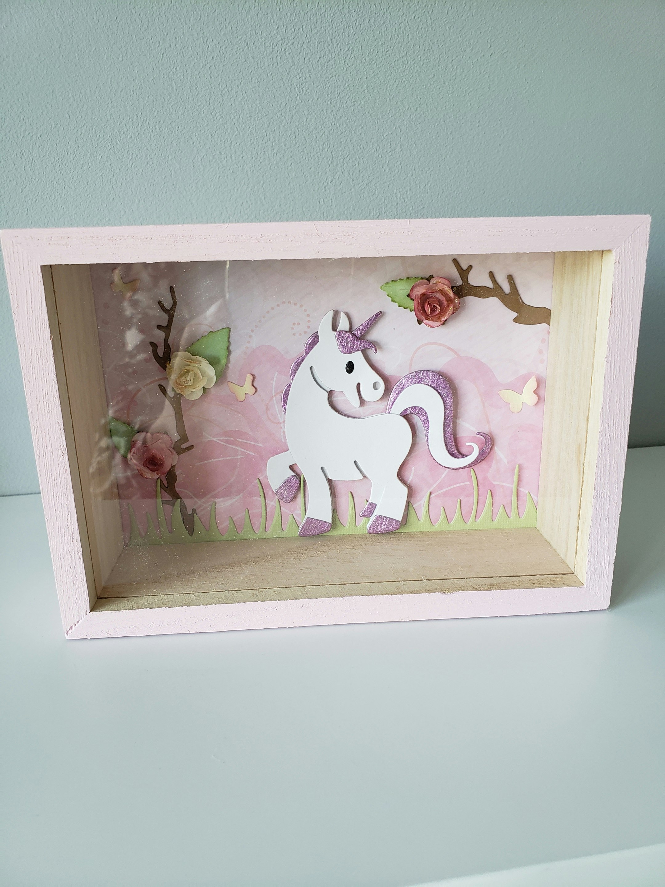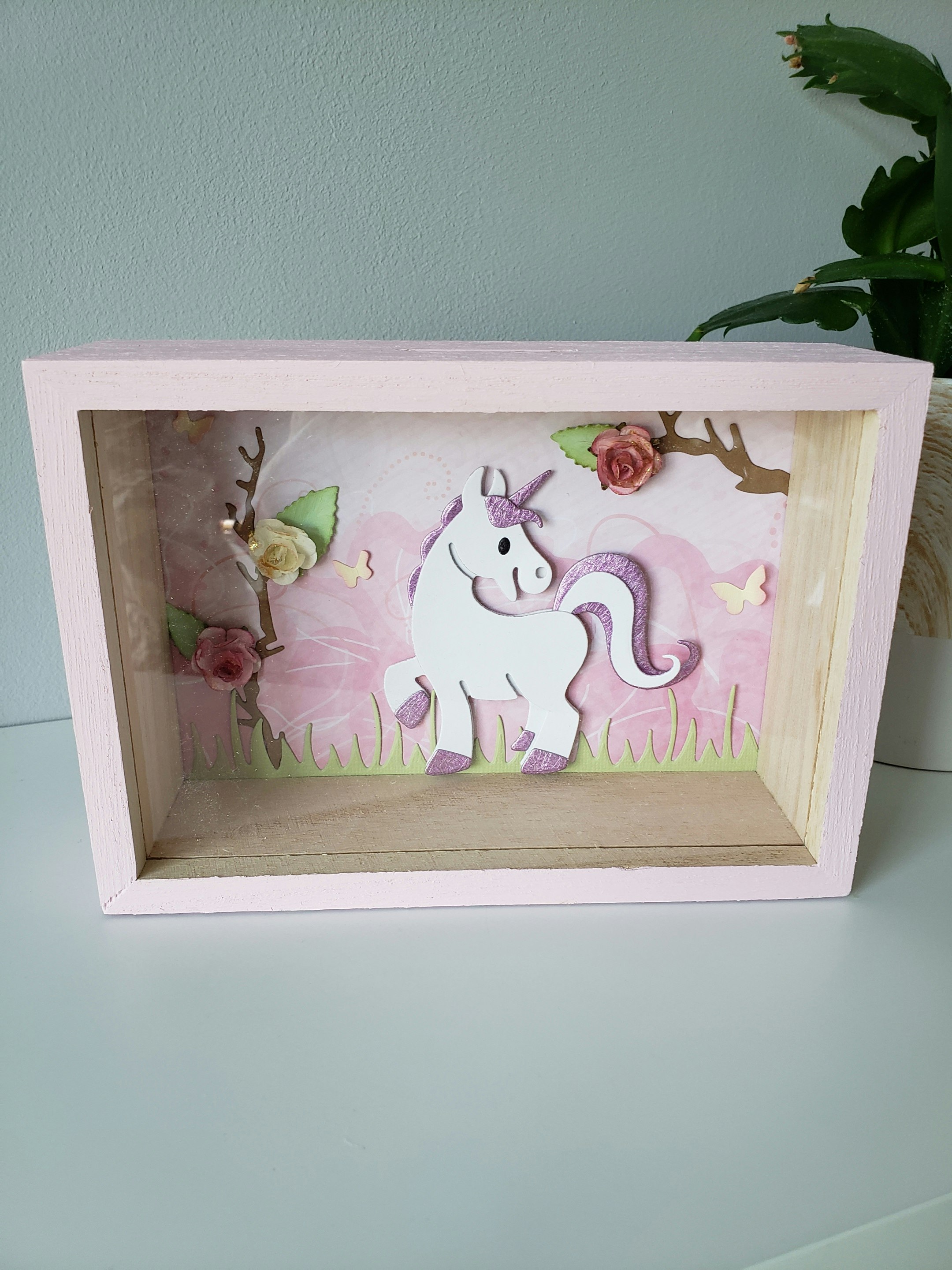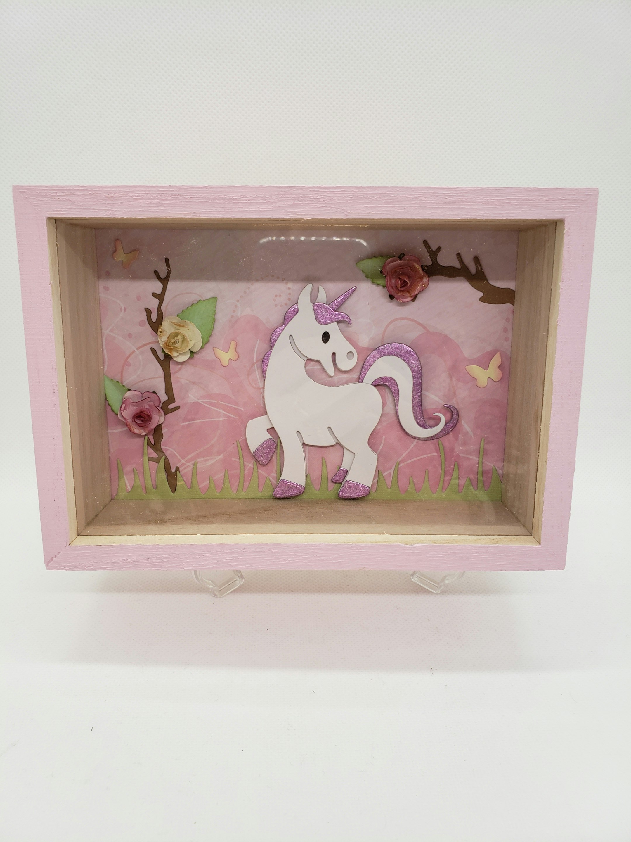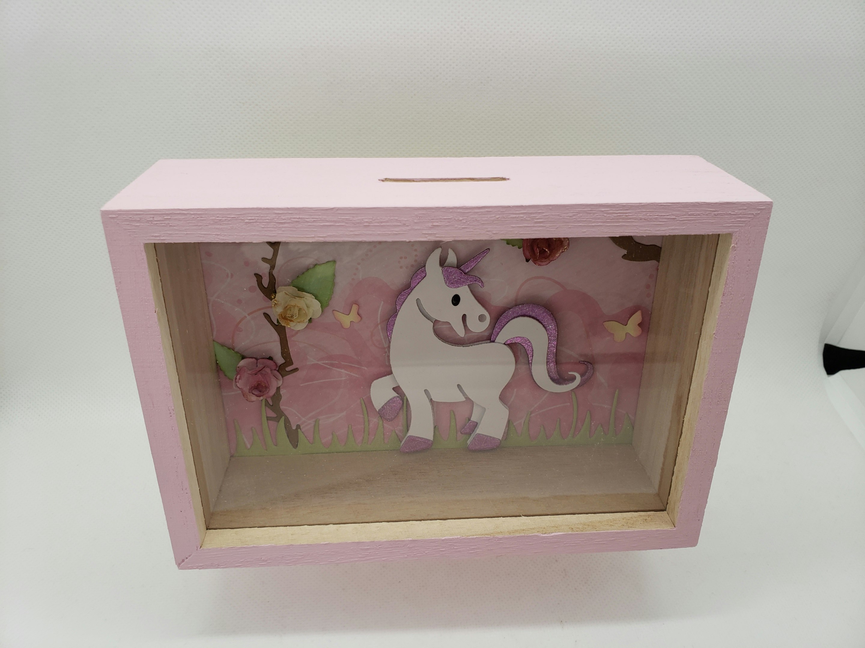 Tirelire fait main en bois. Taille 17x12. A l'intérieur une petite licorne en relief sur un fond rose poudré. Quelques branches marron avec des roses en papier en relief. La tirelire est de couleur rose pastel. Possibilité de rajouter un prénom sur simple demande.