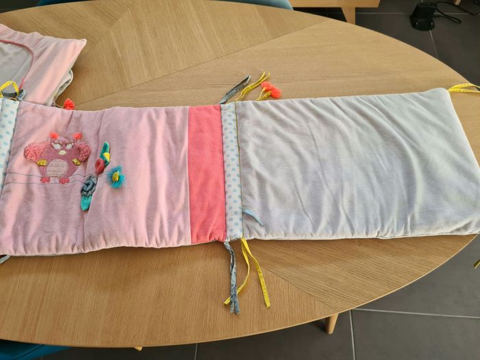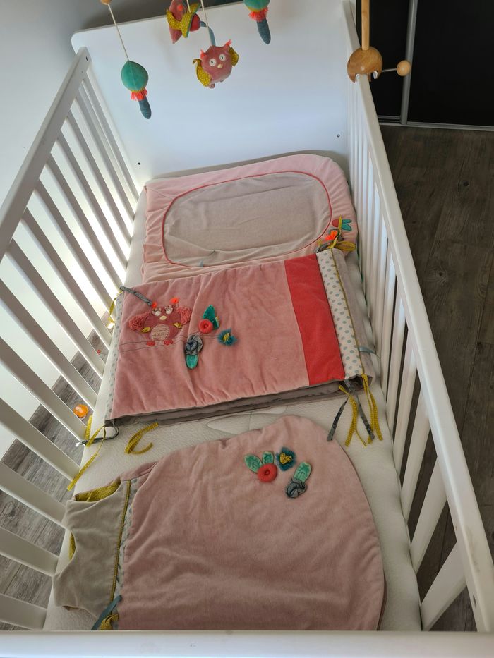 Ensemble gigoteuse, tour de lit, matelas à langer, mobile musical de la collection Mademoiselle et Ribambelle de chez Moulin Roty. L'ensemble est encore en très bon état car ce sont des produits de qualités. Il y a juste le mobile musicale qui ne fonctionne plus mais je me suis renseignée et il vous suffit de racheter une boîte musicale à 10 euros sur Amazon .