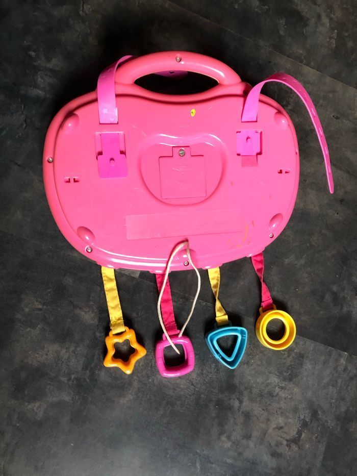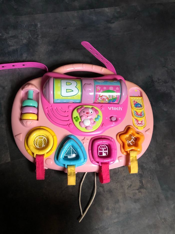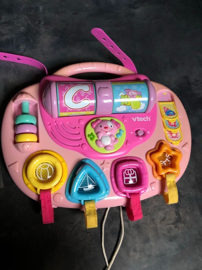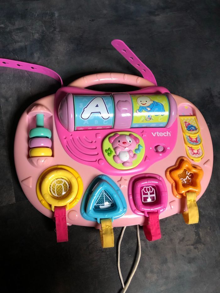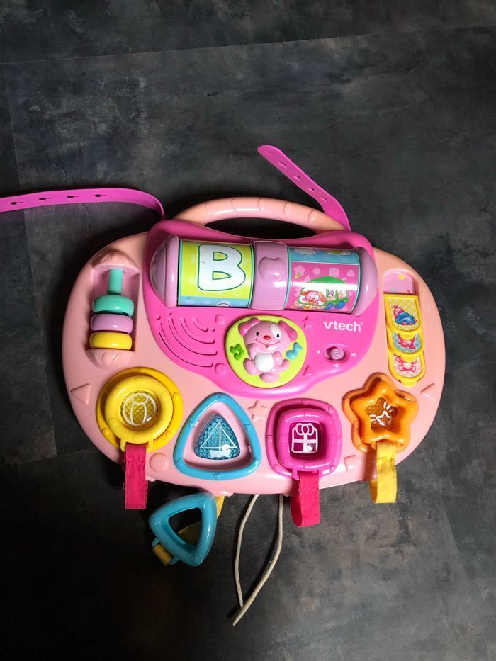 Tableau d’activités lumineux et musical à crocher sur le lit à barreaux ou le parc Ou à promener partout grâce à sa poignée dès la naissance Plusieurs mélodies connues Lumières sons formes couleurs etc Vtech Fonctionne avec 3 piles LR06 non fournies Plastique rose un peu jauni sur le dessus sinon très bon état