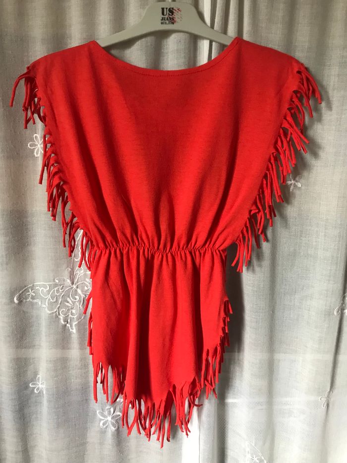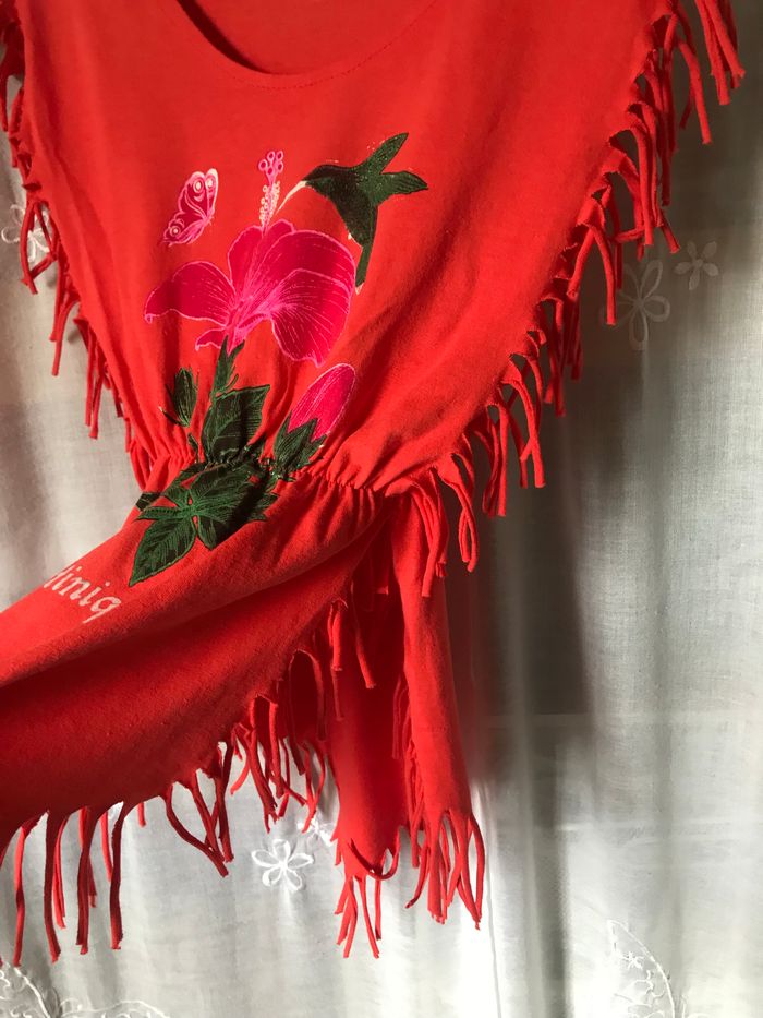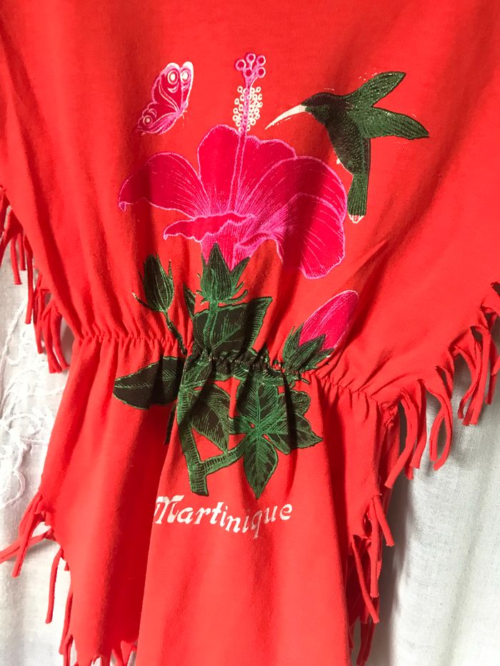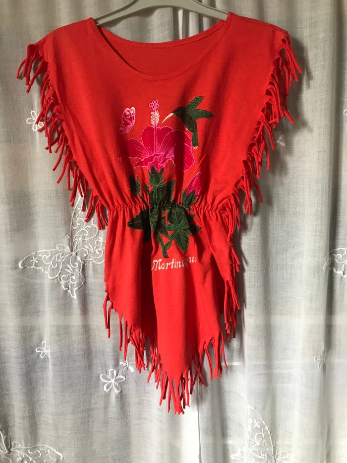 Tunique tropiques à franges saumon corail imprimé Martinique pour enfant taille unique , idéal pour 5/6 ans Largeur à plat niveau ceinture en tirant 37 cm Longueur environ 60 cm avec les franges