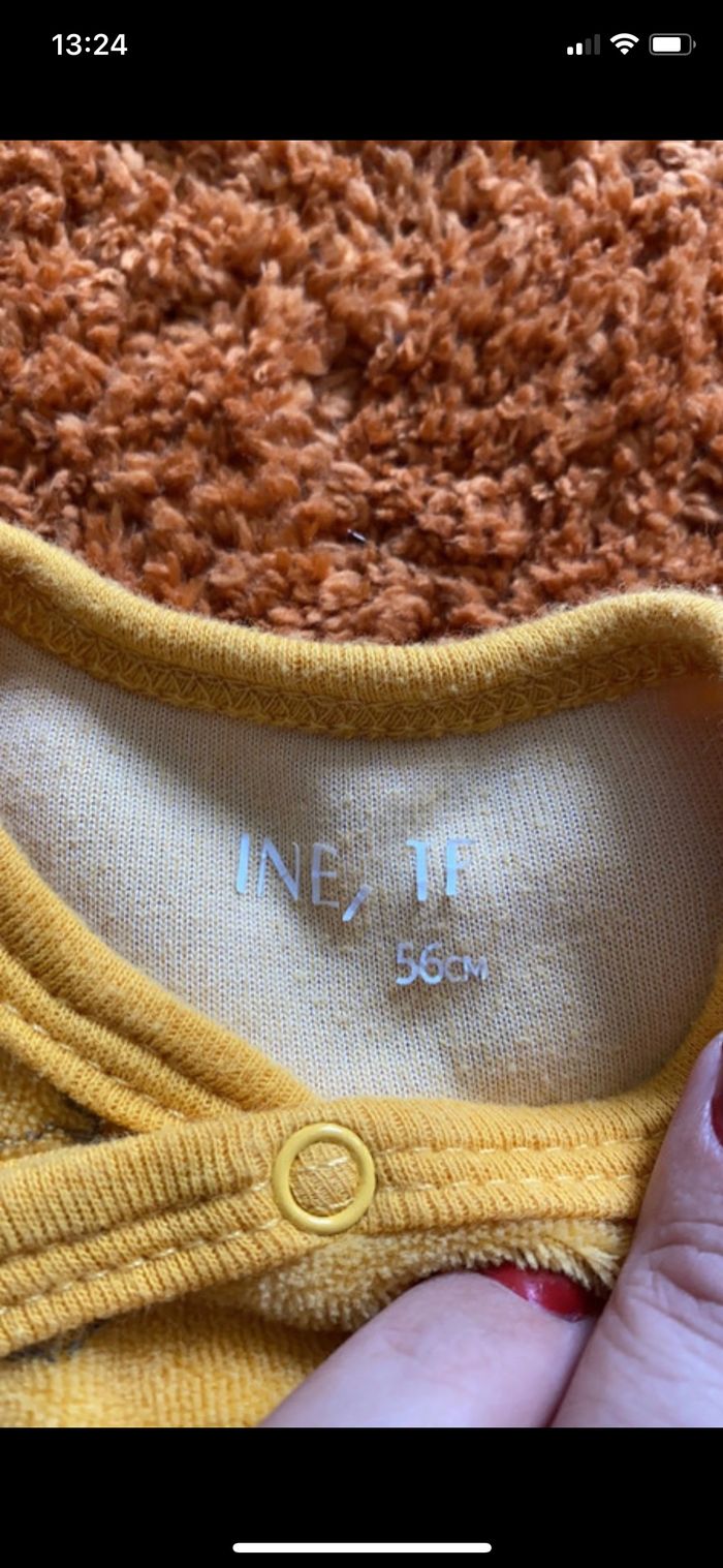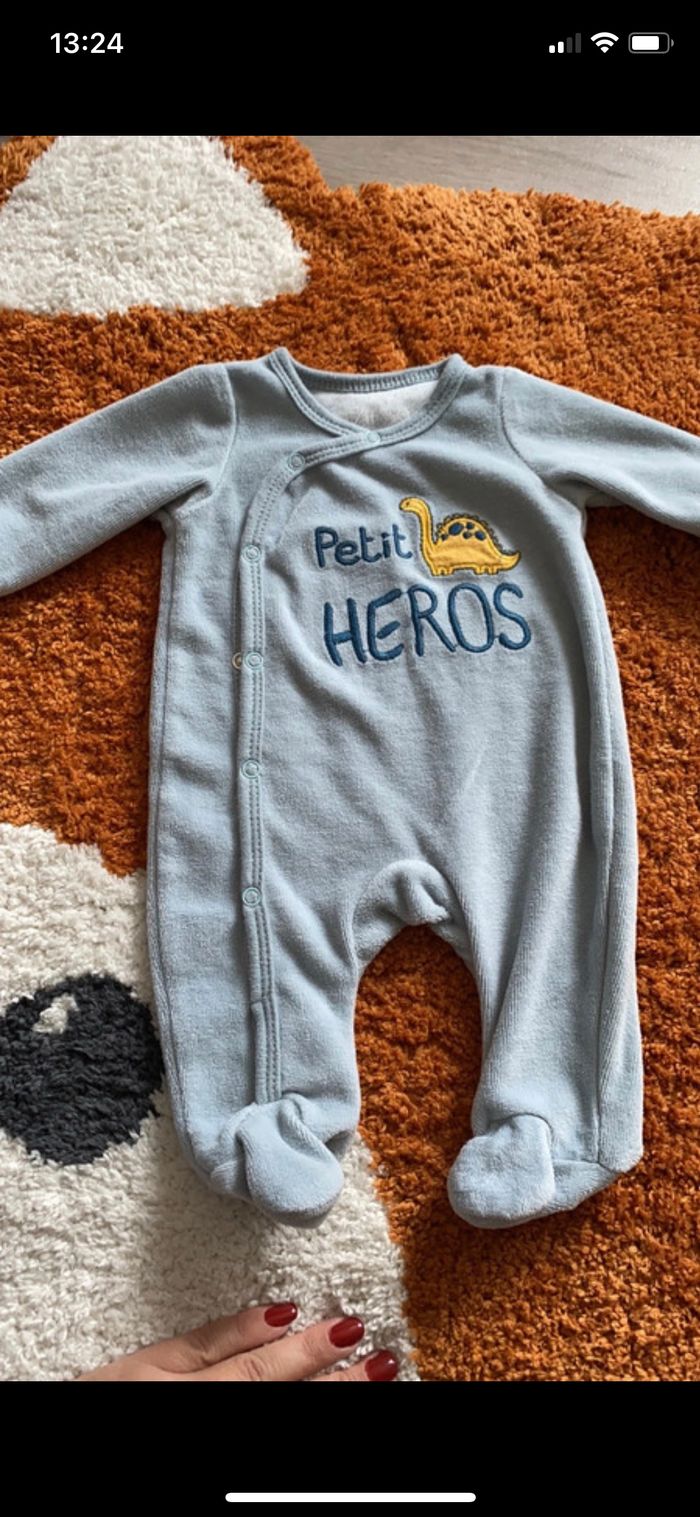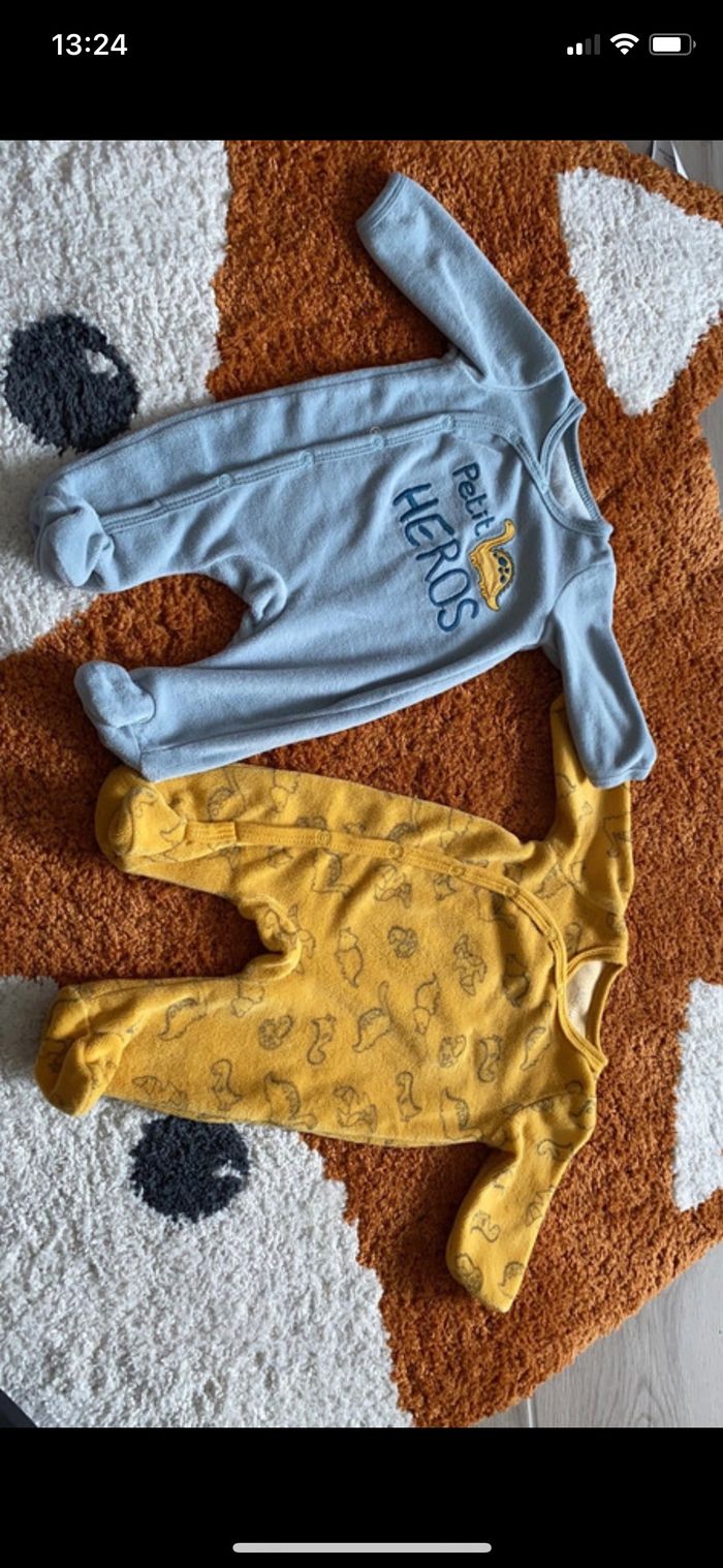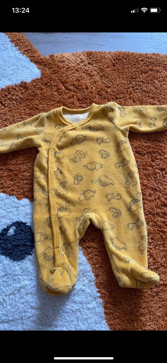 Bonjour, Je vends ce lot de 2 pyjamas velours dinosaures Marque in extenso Taille 1 mois Excellent état, très peu porté ( sur le jaune, la marque s’efface voir photo)
