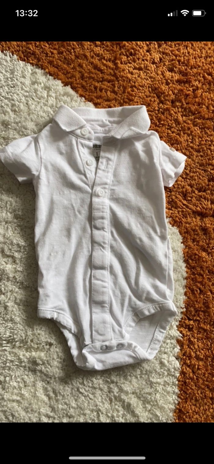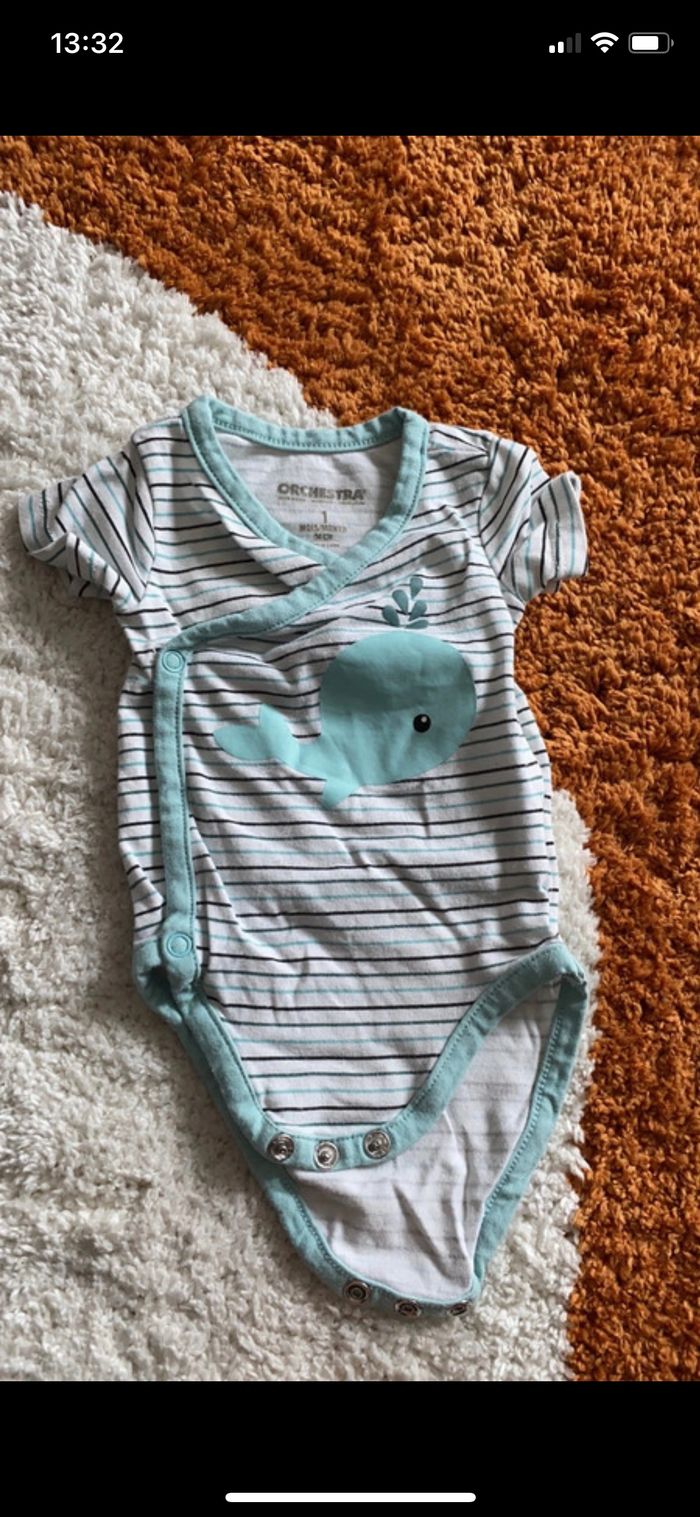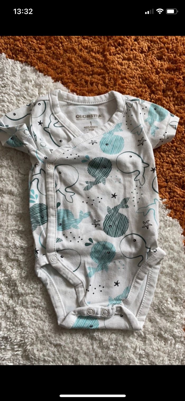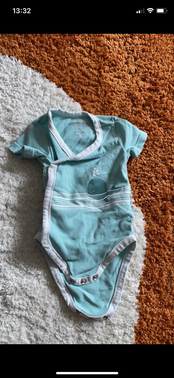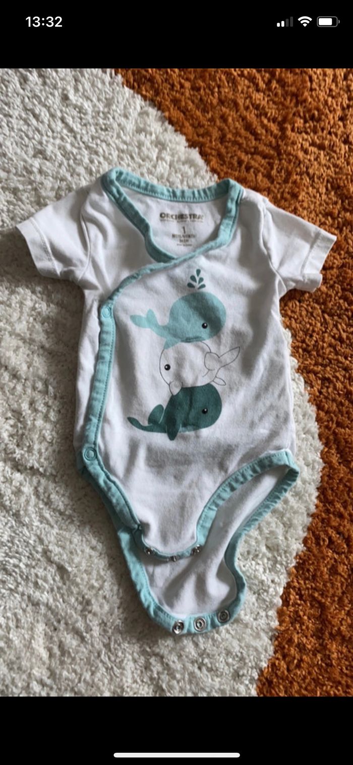 Bonjour Je vends ce lot de 6 bodies manches courtes taille 1 mois Orchestra Bon état