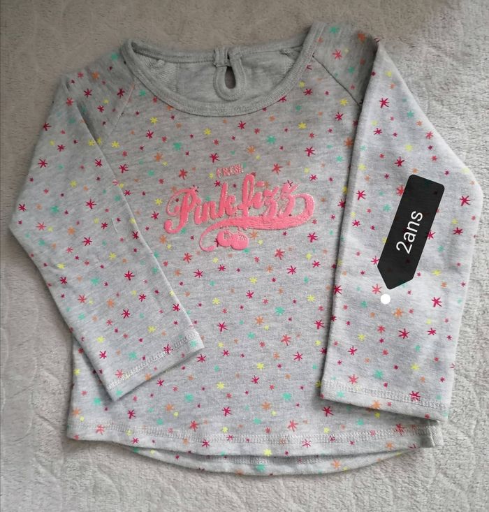 Sweat filles Marque polochon Age 2ans Couleur gris avec des motifs Matière tissus 93%coton. 7%polyester. Neuf sans étiquettes 5€