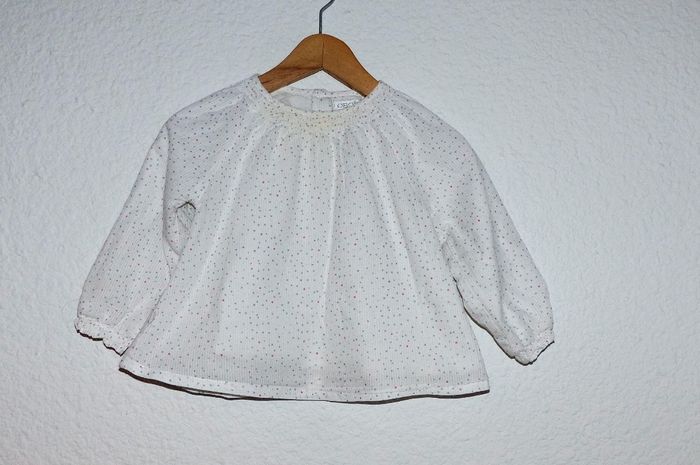 Blouse de marque OBAIBI, doublée, imprimé à pois gris et roses sur fond blanc, état excellent.