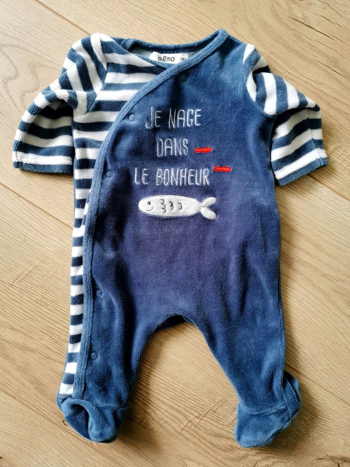 Pyjama velours marque gemo taille 1 mois mais taille assez grand, mon fils l'a mis jusqu'à ses 2 mois et demi et il faisait 60cm