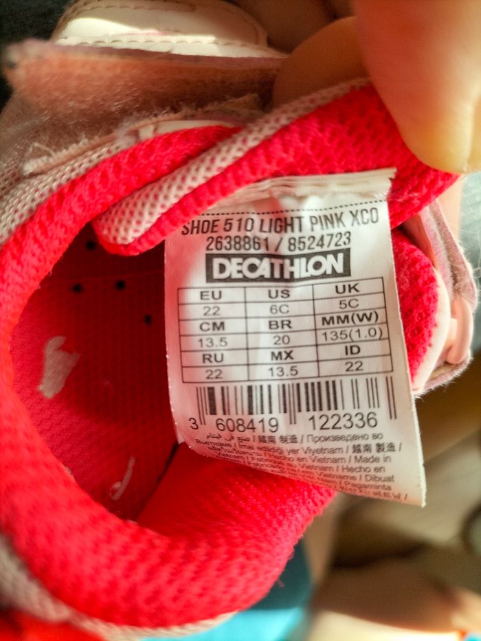 Chaussures fille Decathlon saumon et rose fluo. Portées 6 mois. Pointure 22 normal. Pratiques!