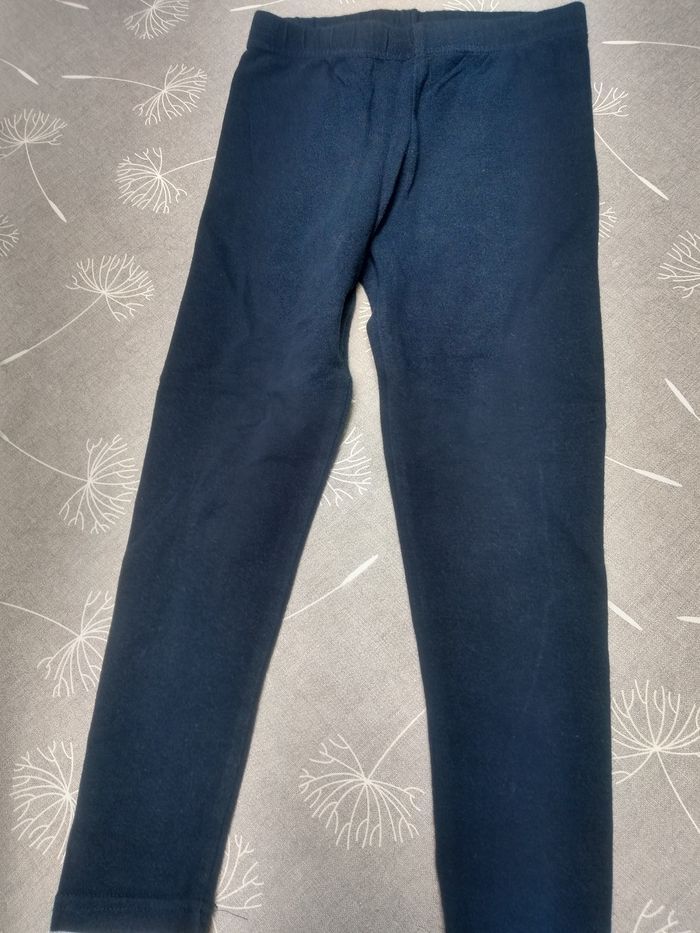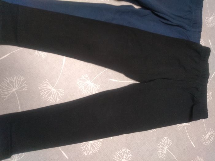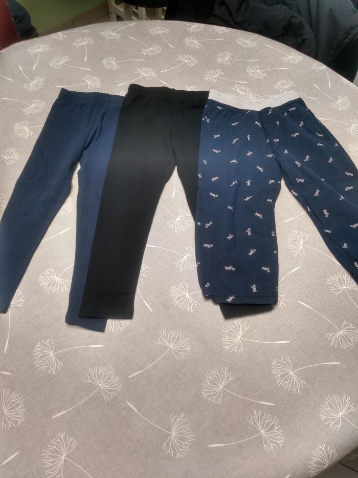 Lot de 3 pantalons : 1 legging noir Zeeman 98/104 1 legging bleu marine Zeeman 98/104 1 pantalon fin sans marque 98 Bon état. Bac 7