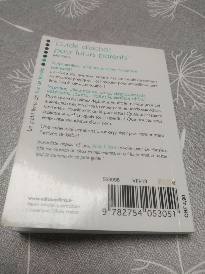 Livre "Guide d'achat pour futurs parents" de Julie Cloris. Livre super utile pour tous les achats prévus pour l'arrivée de bébé. Très bon état, juste pages un peu pliées sur l'arrière (voir photos).